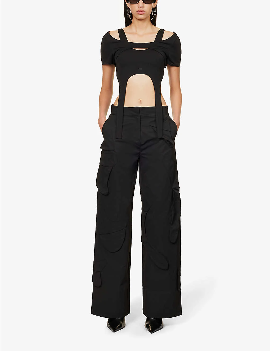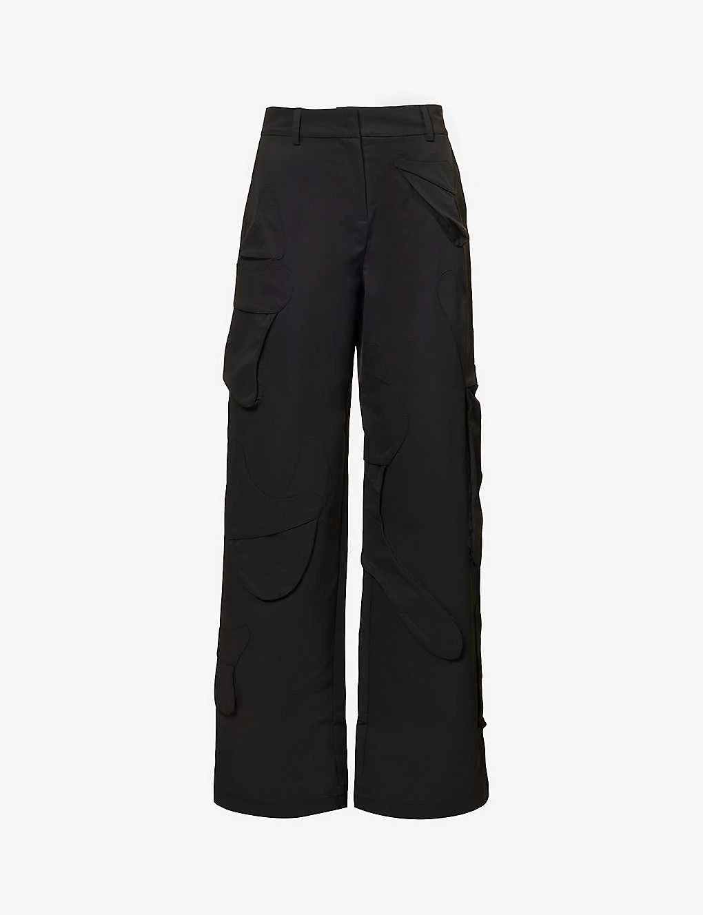 - Regular fit, mid-rise, wide leg, structured waistband with belt loops, darts at back, all-over abstract patch pockets