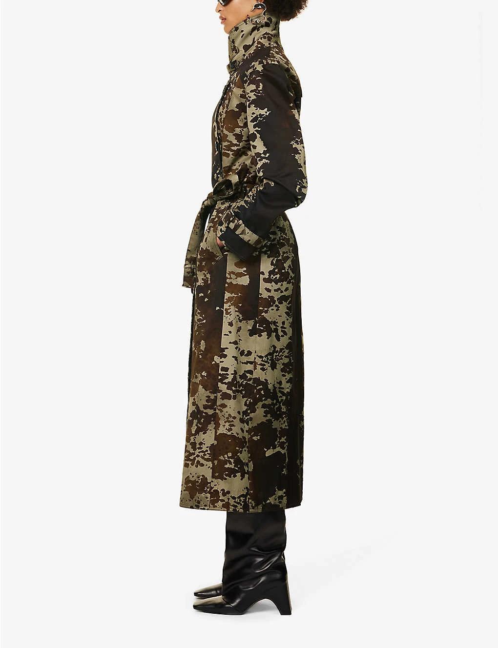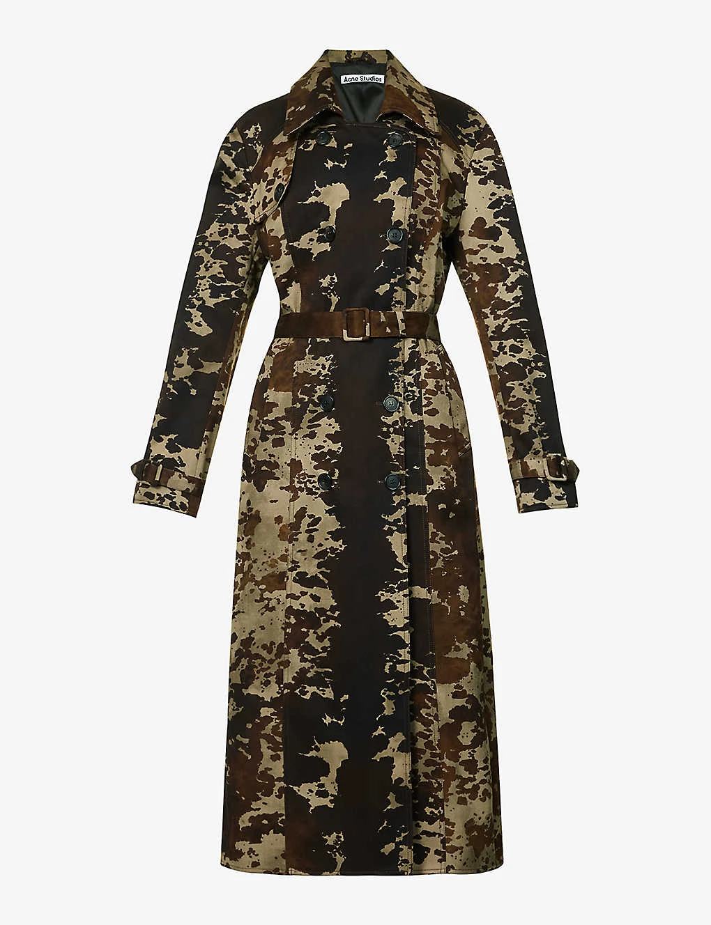 - Regular fit, double breasted, collar, long sleeves, adjustable buckle cuffs, buttoned storm flap, belt loops, detachable buckle belt, two slip pockets at sides, faux storm flap at back, vent at back, all-over cow print, fully lined