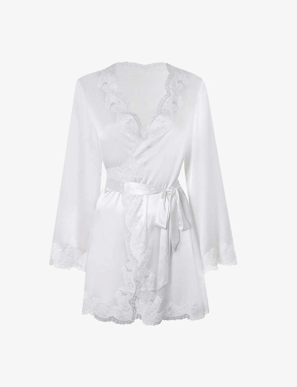 - Scalloped lace trims at neck, cuffs and hem, long sleeves, lace wrap silhouette, belted