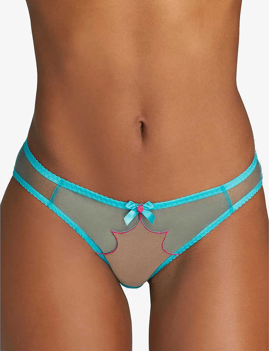 - Low rise, elasticated waistband, front bow, embroidered panel at front, sheer, fully lined gusset, full coverage at back