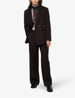 - Fitted, lapels, padded shoulders, long sleeves, buttoned cuffs, welt pocket at chest, asymmetric panels at sides, double vents at back, fully lined