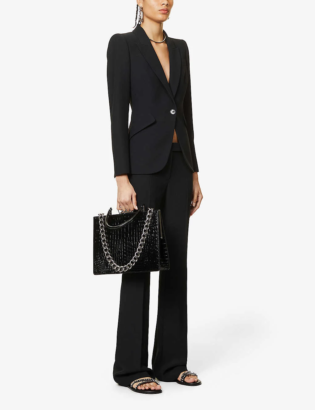 - Regular-fit, high-rise, bootleg, belt loops, structured waistband, two slip pockets at front, pressed centre creases at front and back, welt pocket at back, partially lined