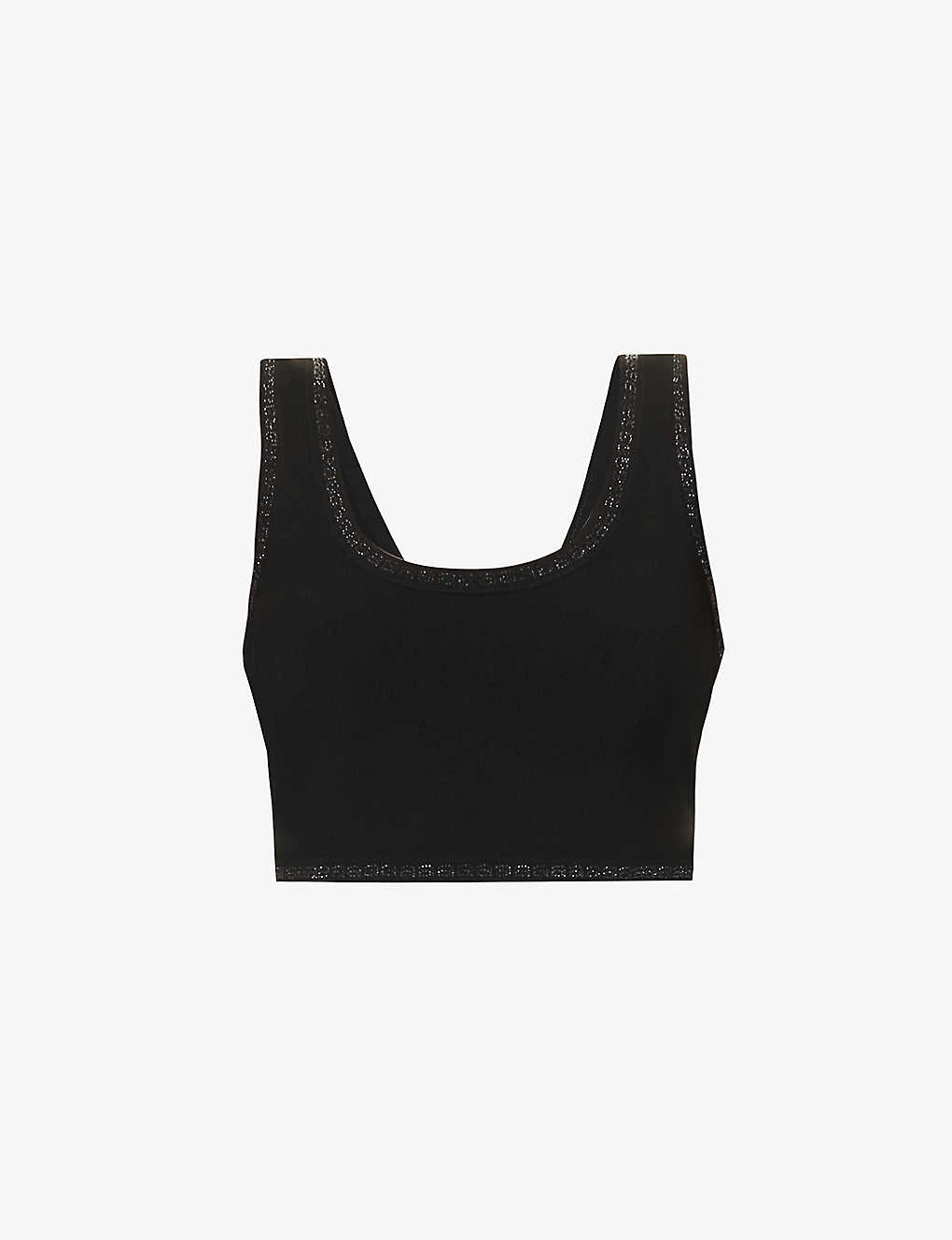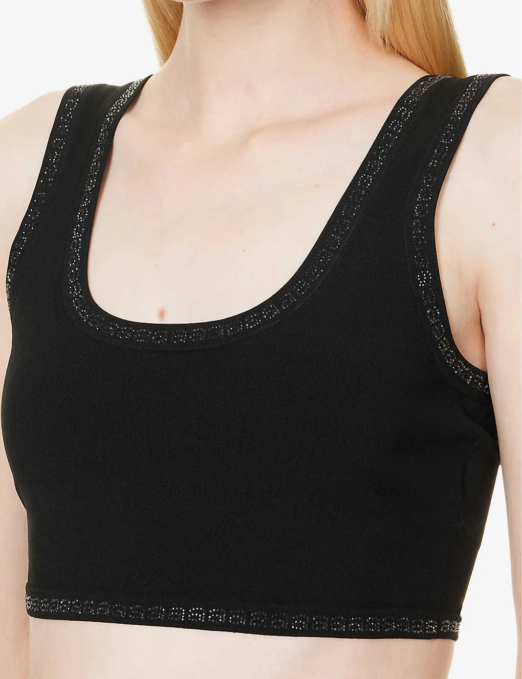 - Slim fit, scoop neckline, sleeveless, all-over branded embellishments, knitted, cropped