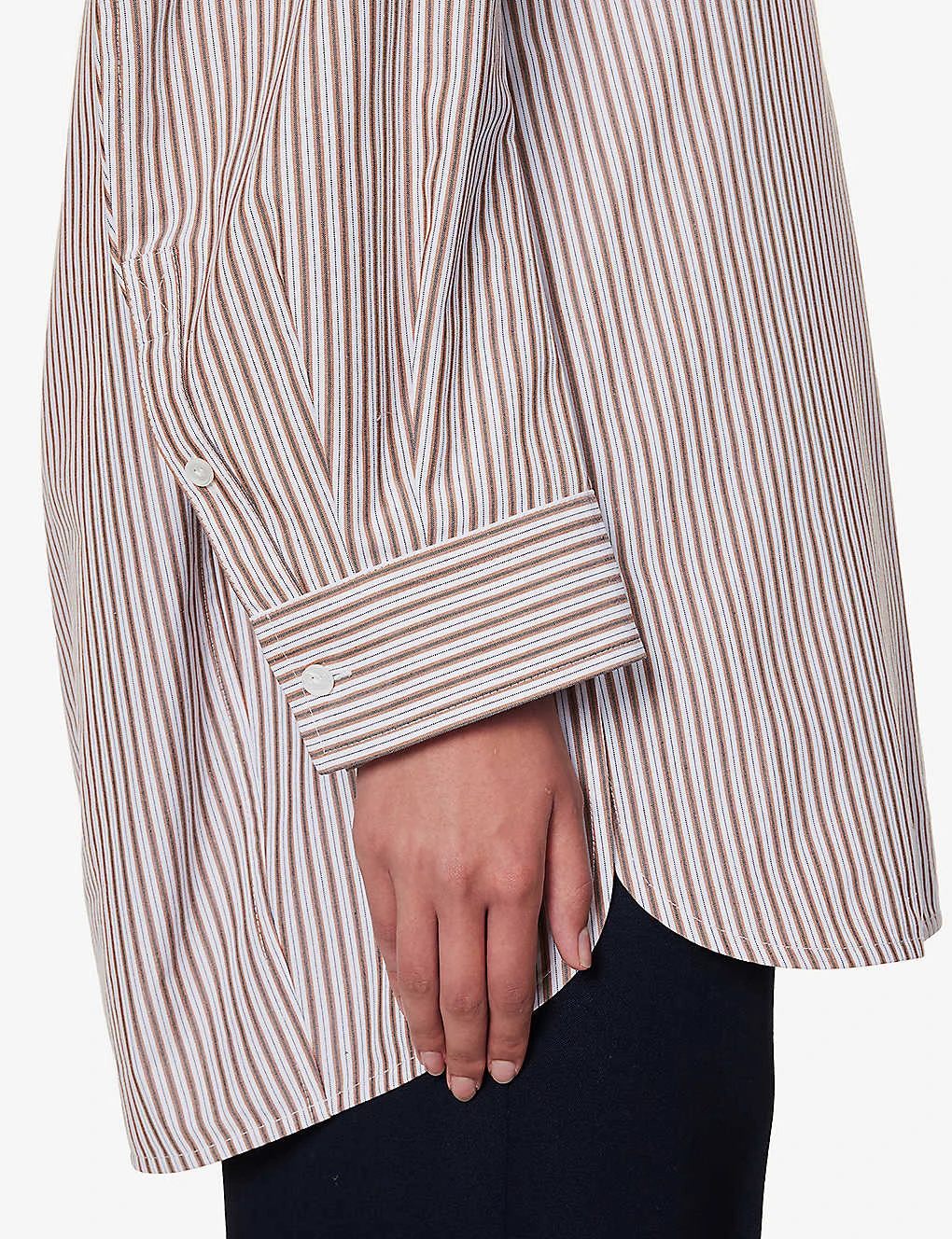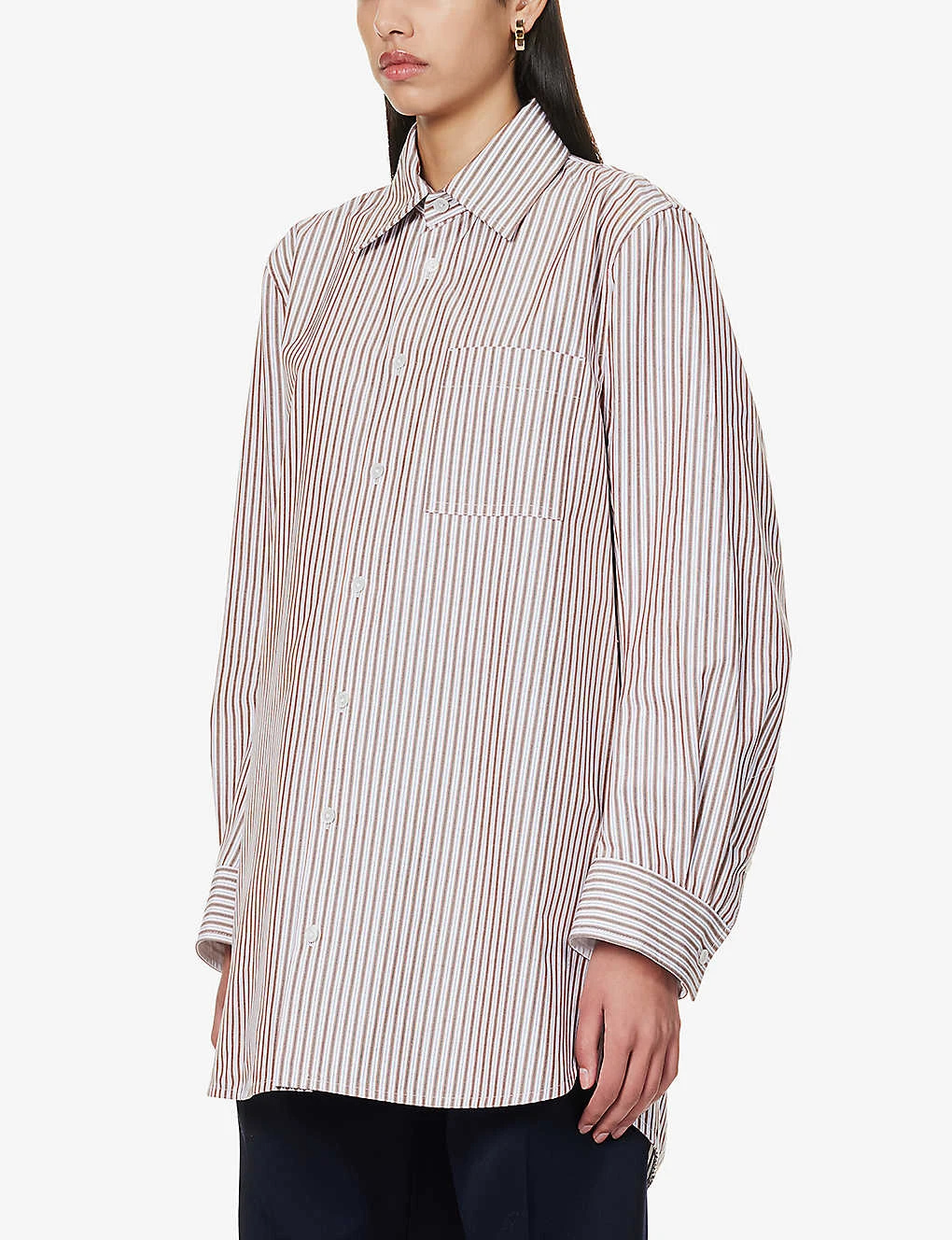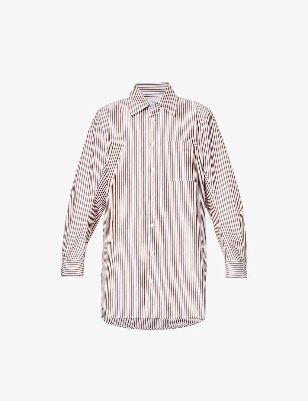 - Relaxed fit, collar, long sleeves, buttoned sleeve hems, patch pocket at chest, straight yoke with pleat at back, all-over stripe pattern, branded pearlescent buttons, dipped curved hem