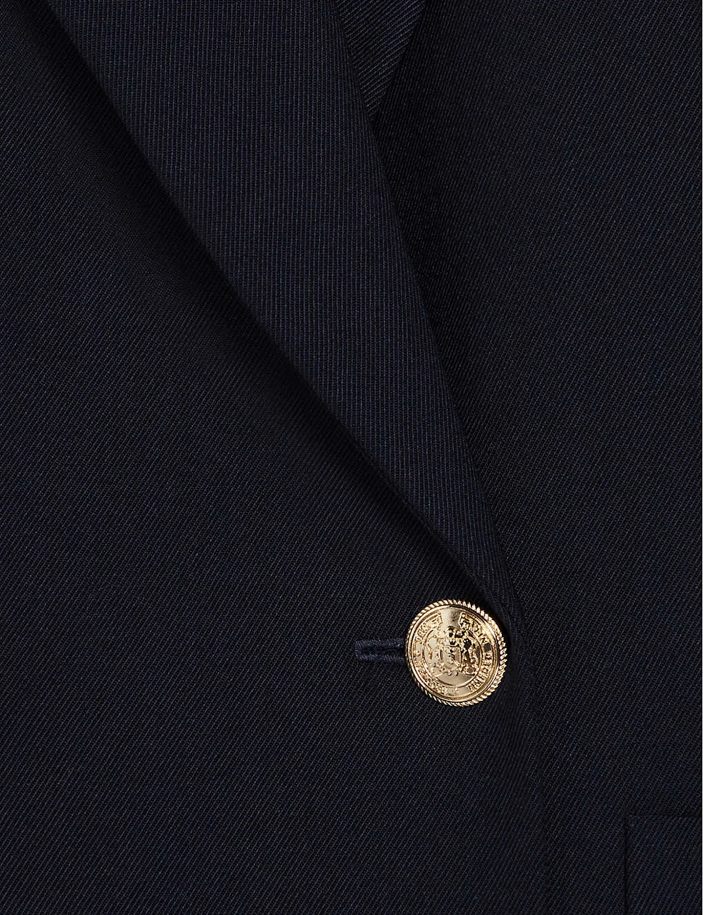 - Long sleeves, peak lapels, double-breasted button fastening, chest welt pocket, two side large patch pockets, decorative gold-tone buttons, buttoned cuffs, English back vents, fully lined