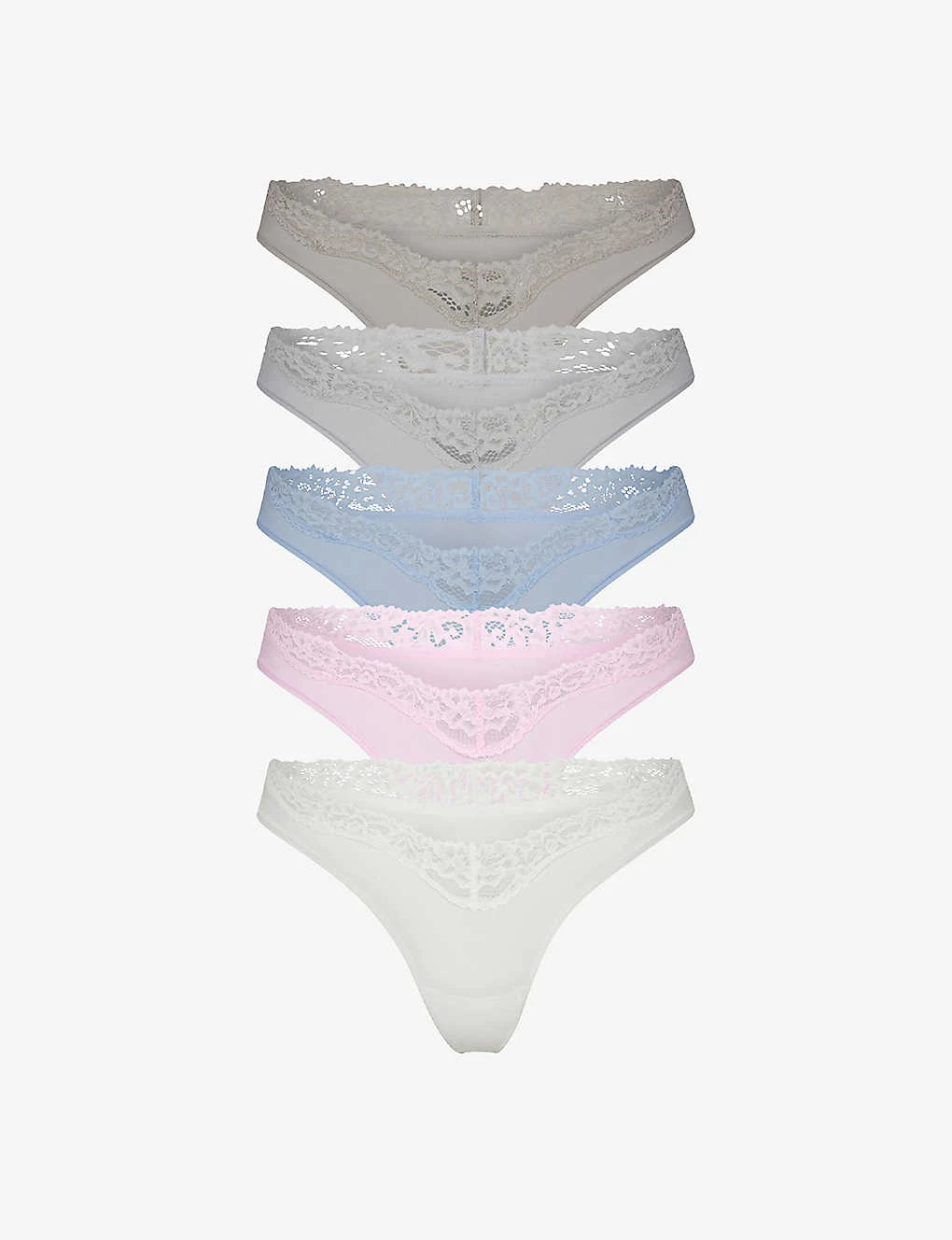 - Lace trim top, minimal coverage, high cut leg, pack of five, multiple colours