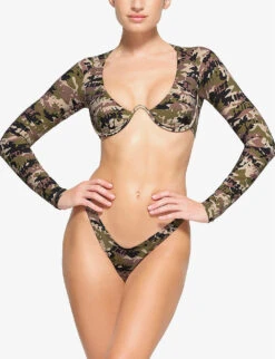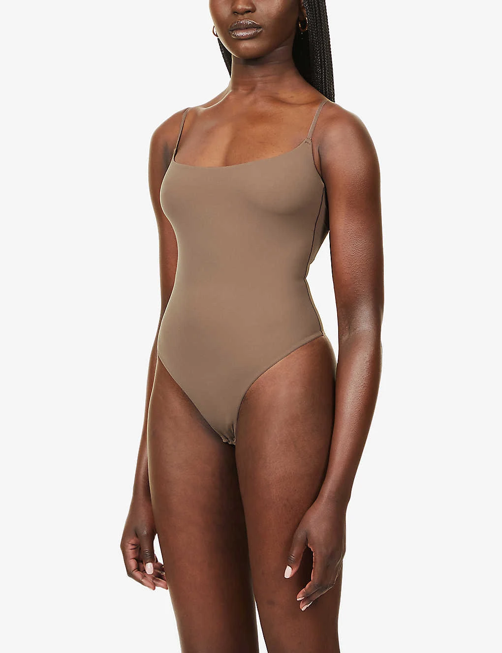 - Fitted, scoop neck, adjustable shoulder straps, exposed seams, V-string at back, fully lined