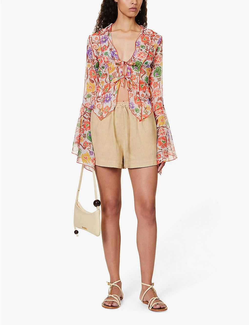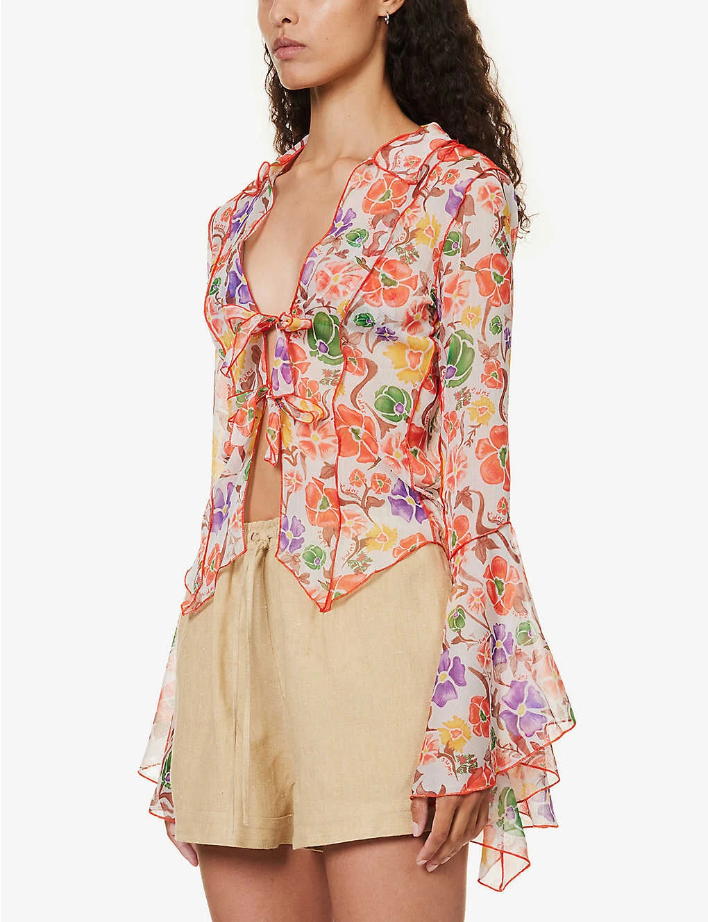 - Regular fit, V-neckline, ruffle collar, long flared sleeves, internal triangle bra, floral pattern, soft crease texture, sheer