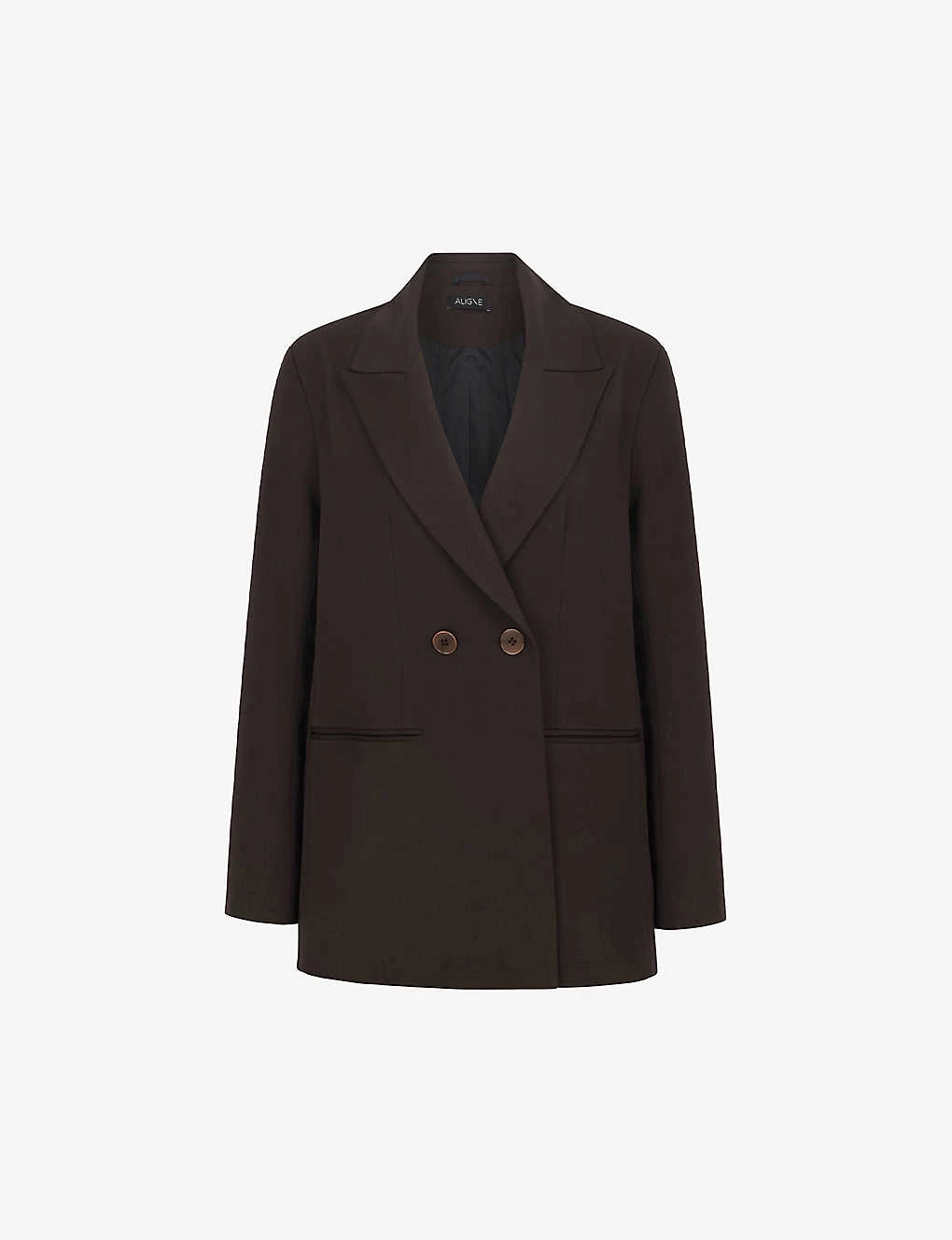 - Oversized, V-neck, peak lapels, single-breasted, jet pockets at front, long sleeves, exposed single-button fastening at front, lined