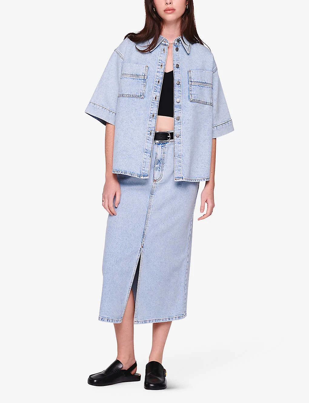 - High-rise, midi length, belt loops, five pockets, light wash, contrast stitching, split at front hem