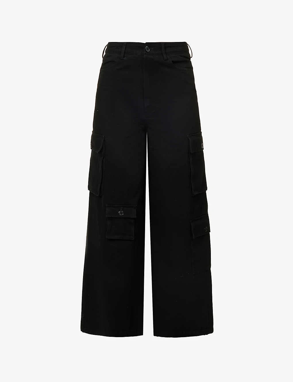 - Regular-fit, high-rise, wide leg, belt loops, two slip pockets at front, all-over twill texture, four buttoned flap pockets at front, all-over twill texture, partially lined