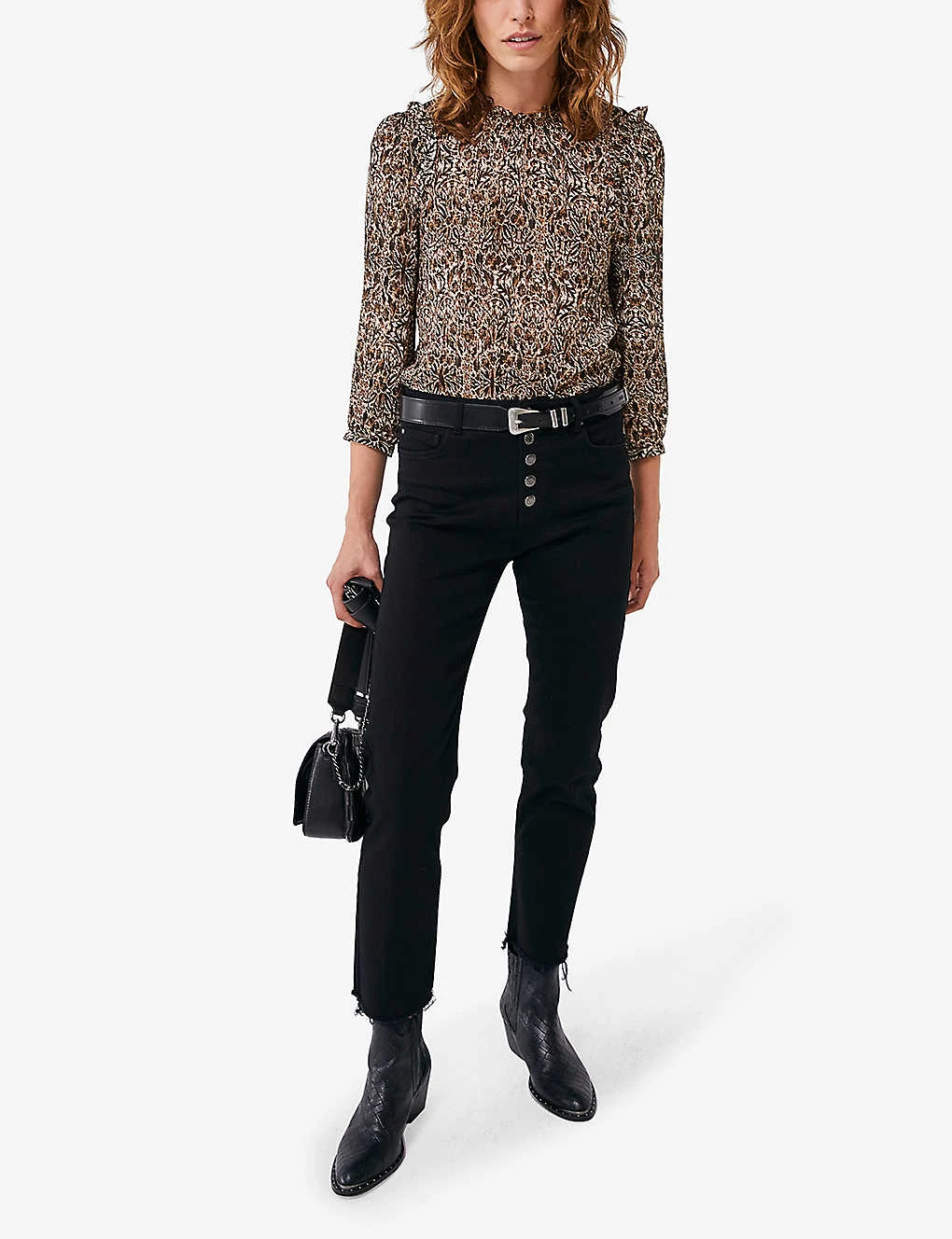 - Loose fit, high neck, ruffles at shoulder, long sleeves, button cuffs, all-over arabesque-print, button fastening at back