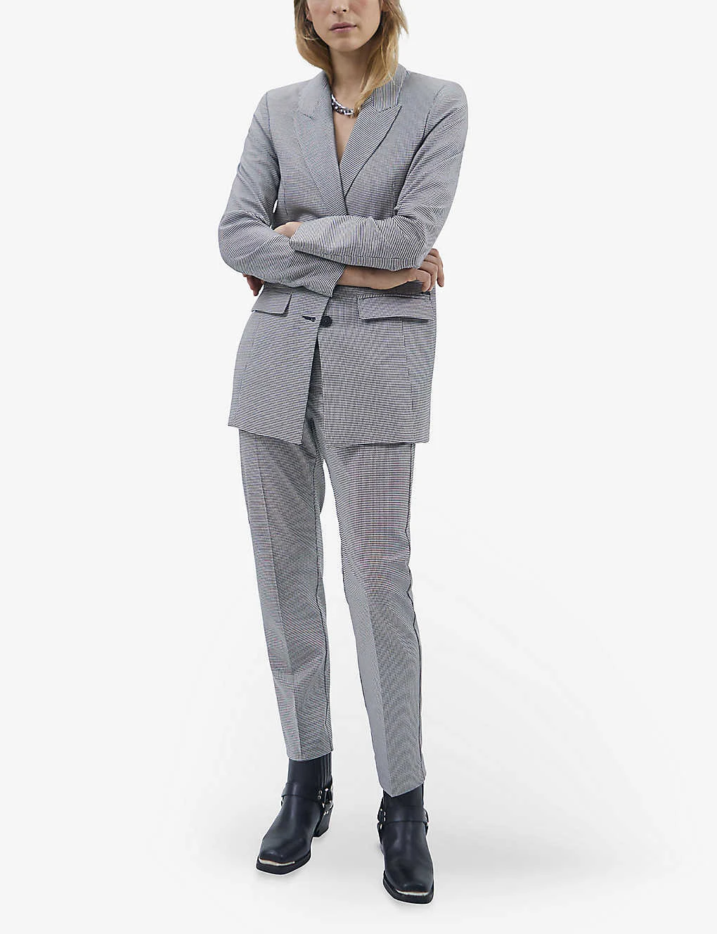 - Straight fit, peak lapels, long sleeves, button cuffs, fringed lighting badge on lapel, two pockets at front, all-over houndstooth check, lined