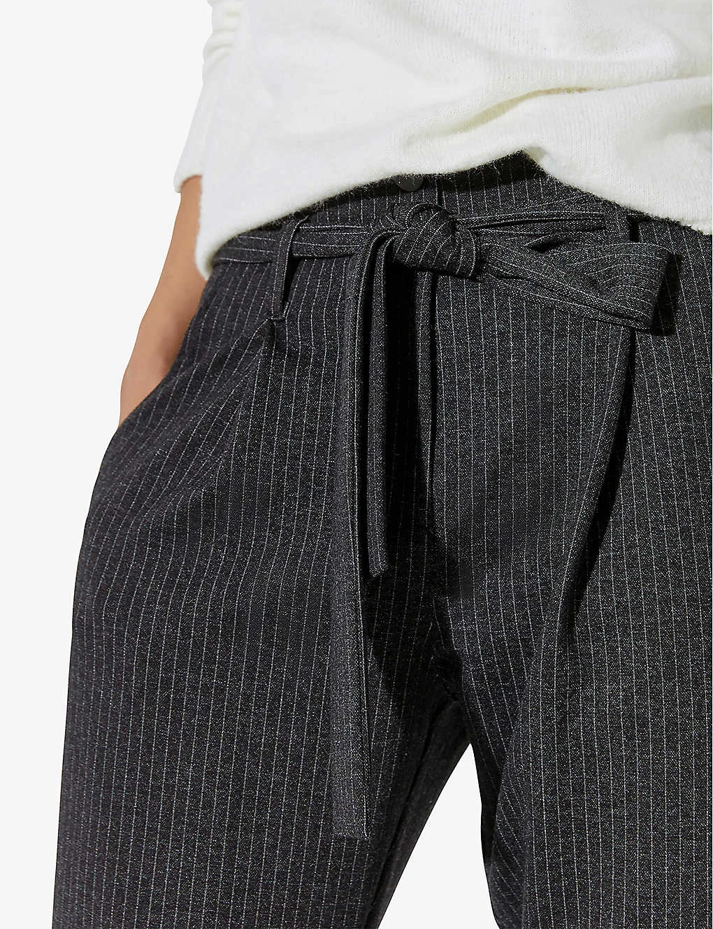- Striped, straight legs, high rise, regular fit, unlined, detachable belt, patch pockets