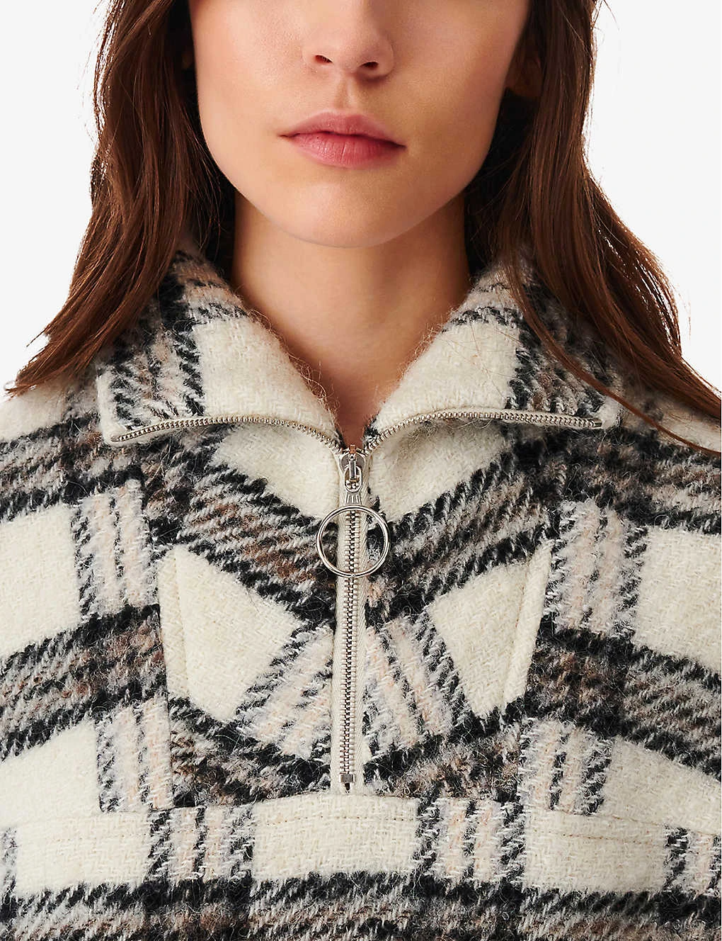 - Pullover style, high collar, exposed zip packet at front, all-over check pattern