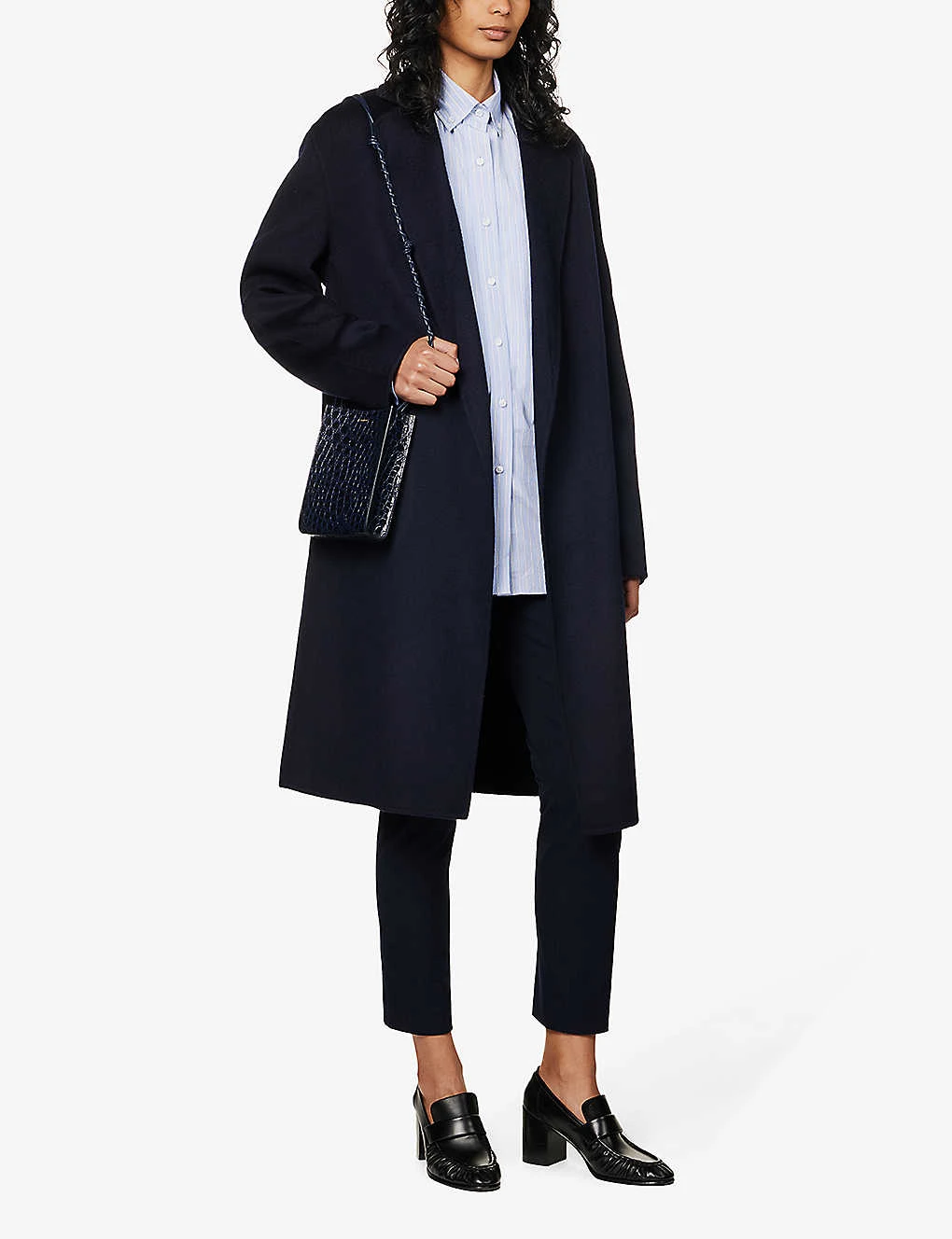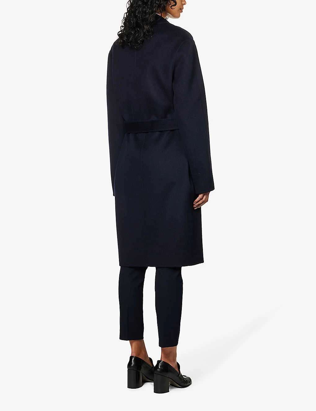Long sleeves, seam pockets at sides, self-tie belt at waist, belted loops, exposed button fastenings at front