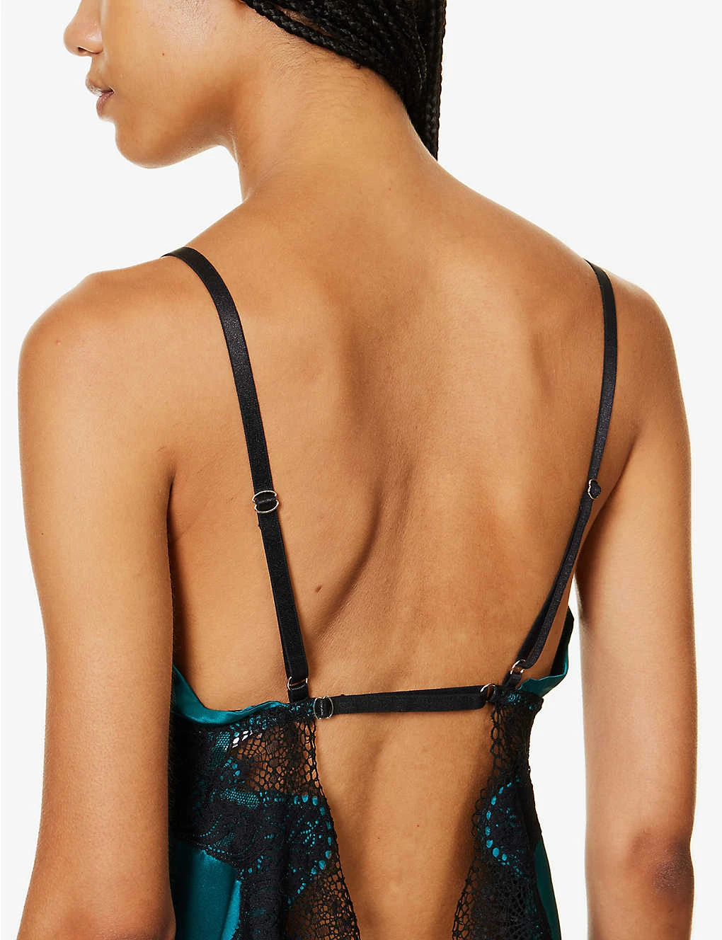 - Regular fit, plunge V-neckline, sleeveless, adjustable straps, lace panels, open back, flared hem, satin texture