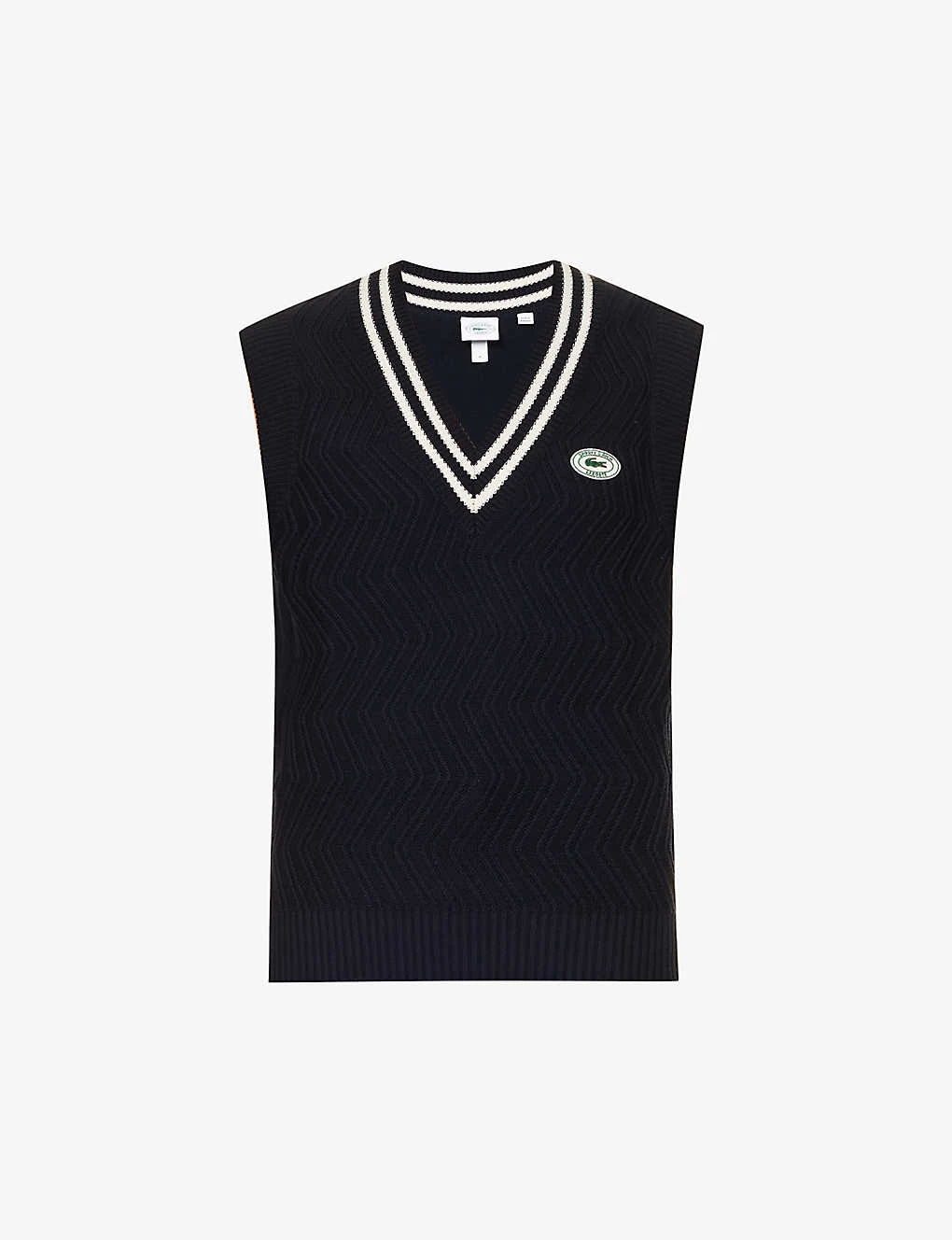 - Regular fit, striped V neck, sleeveless, brand patch at front, zig-zag pattern at front, all over knitted, ribbed trims, elasticated hem