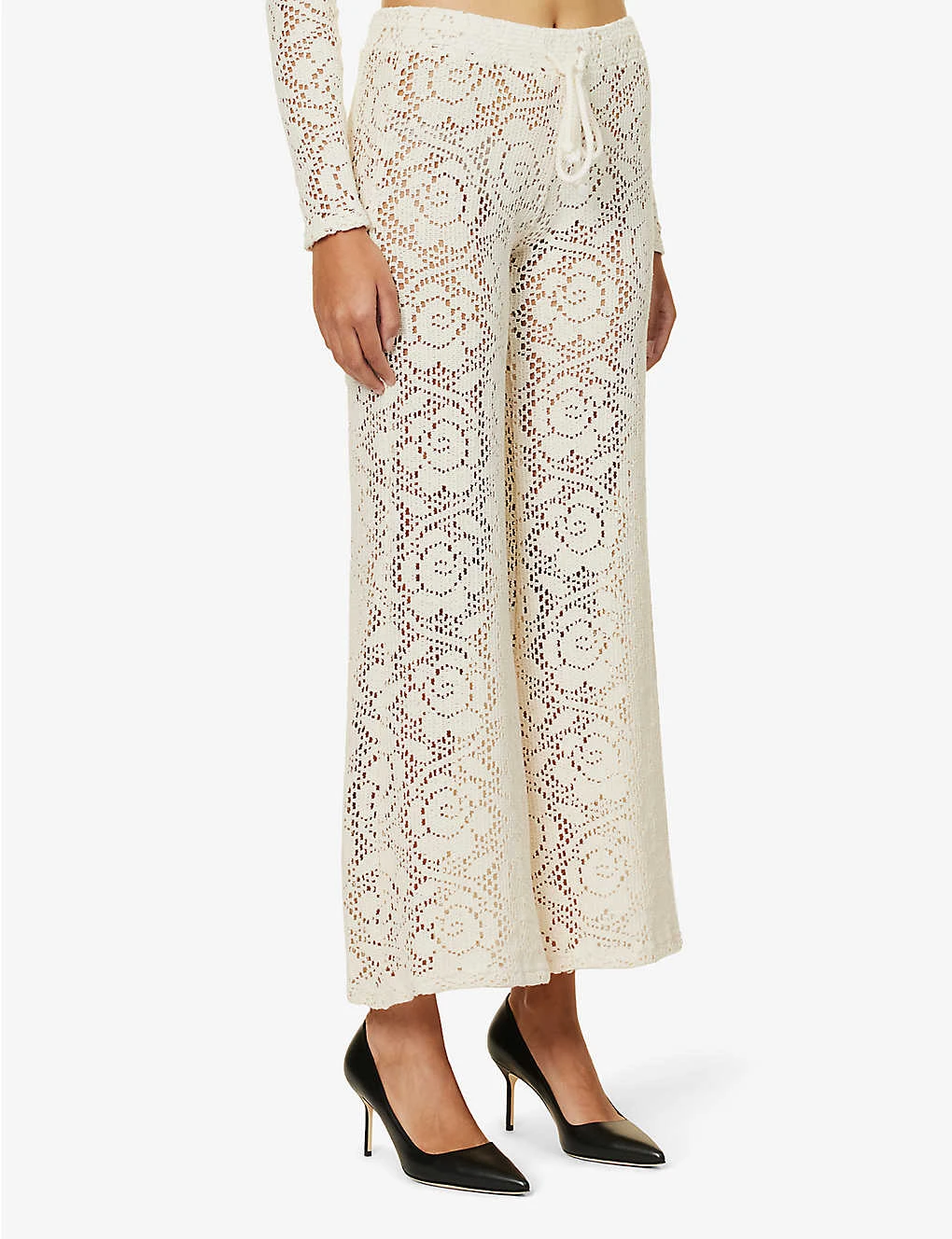 - Regular fit, mid-rise, wide leg, drawstring elasticated waistband, all-over open knit pattern