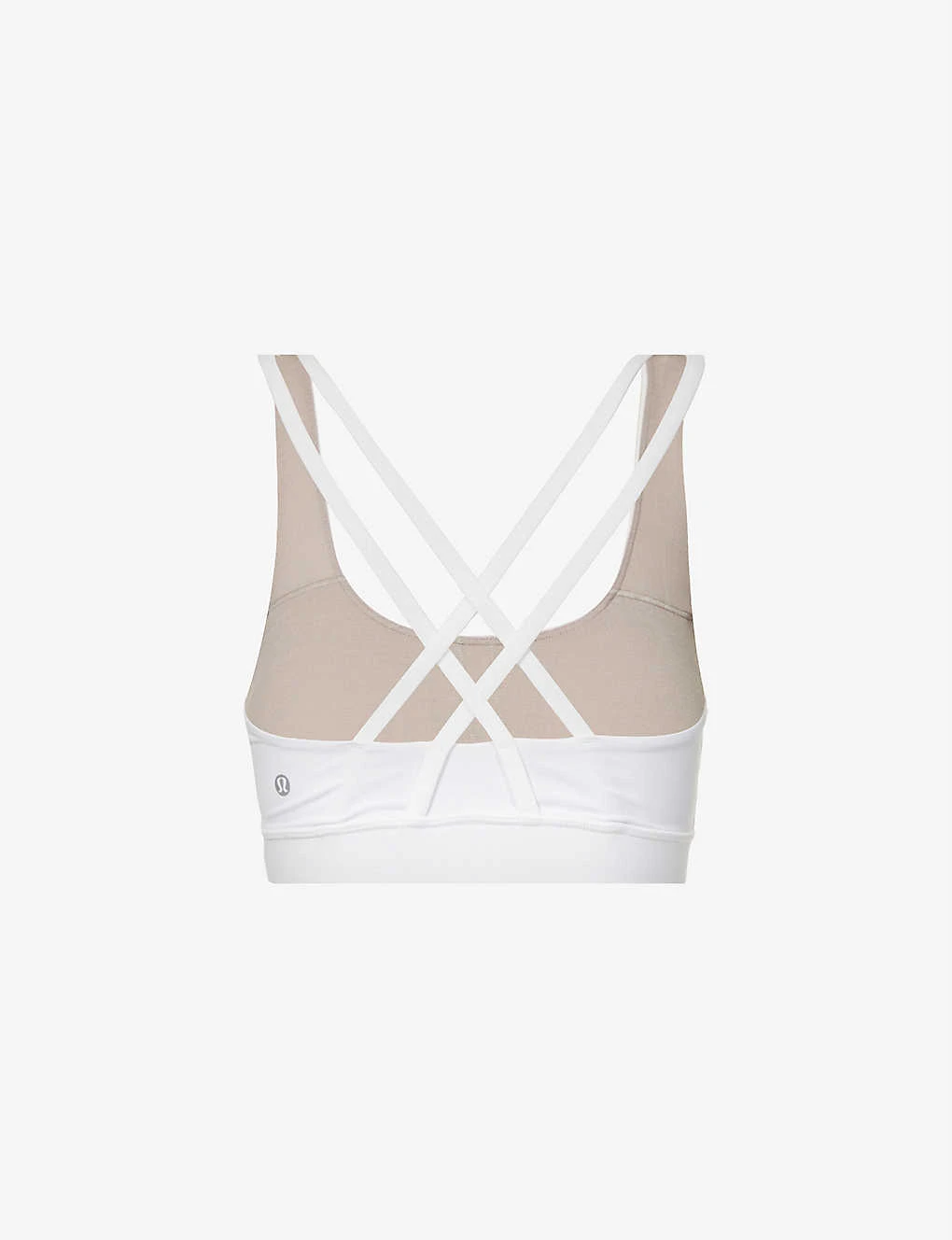- Scoop neckline, soft padded cups, removable pads, brand print at back, cross-over strappy back, medium support, elasticated waistband