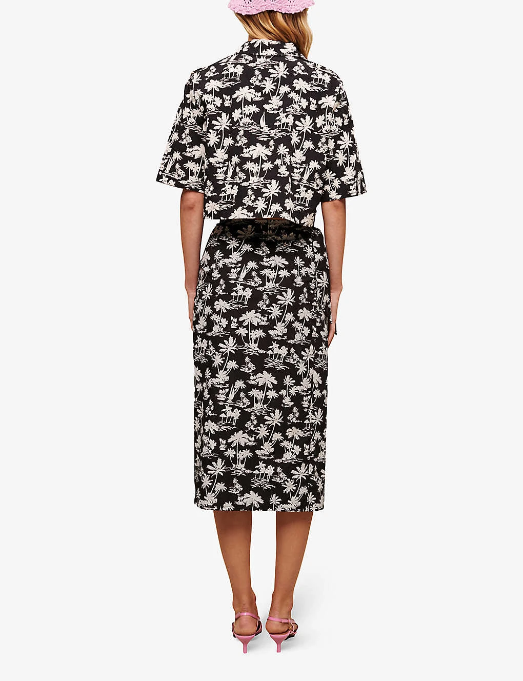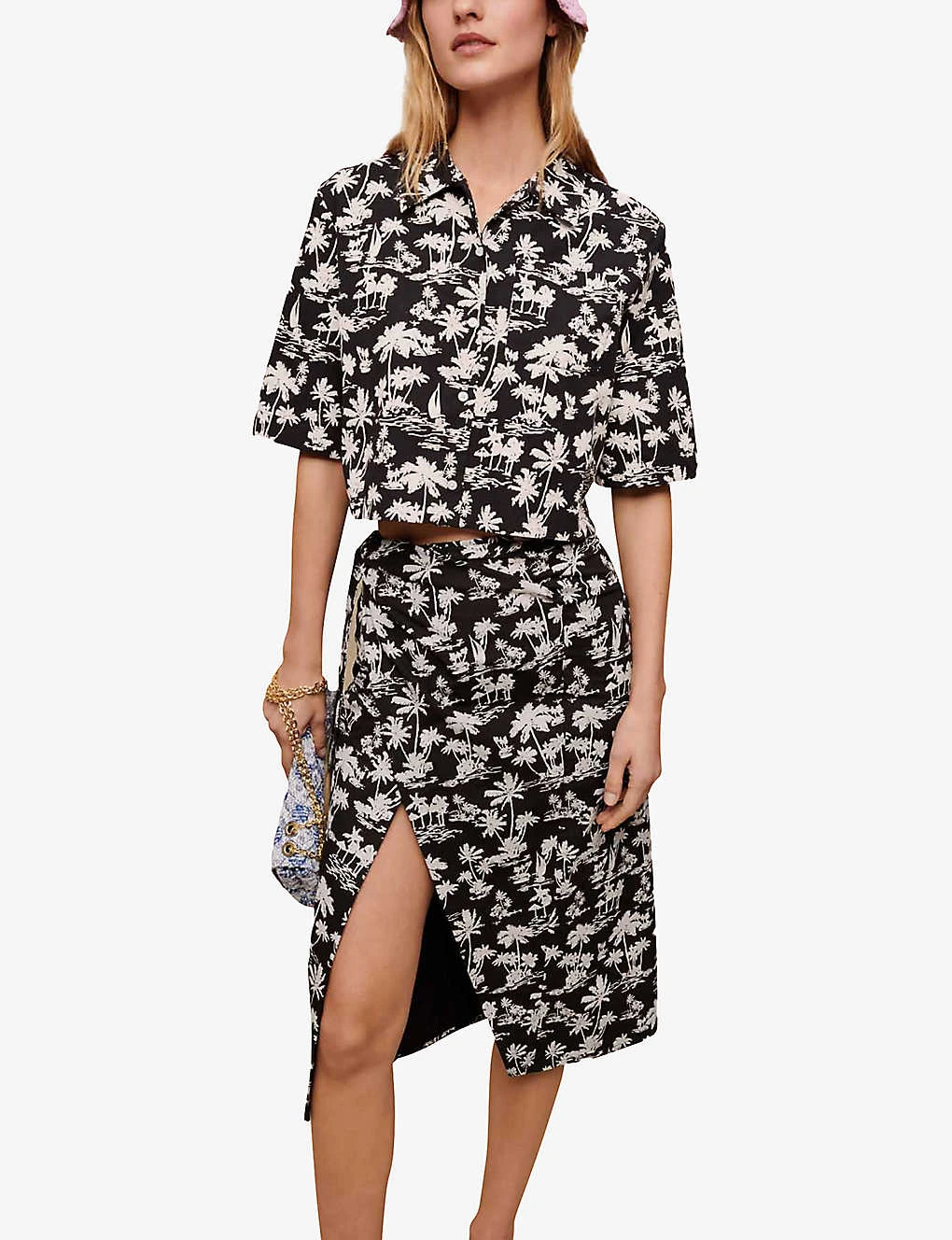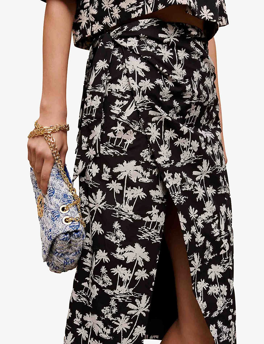- Midi length, high waist, all-over palm tree print, side slit, wrap design