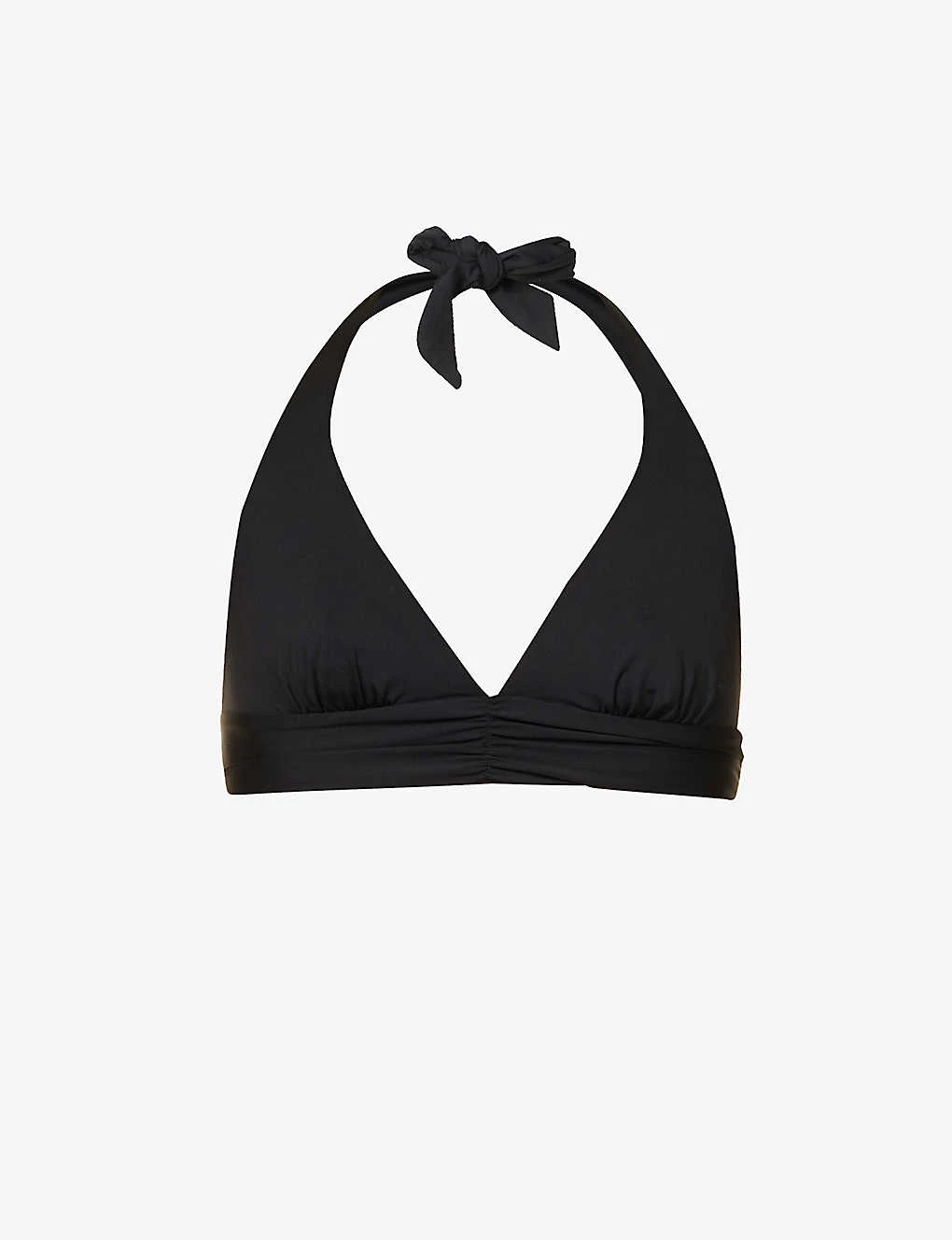 - Halterneck, V-neck, soft triangle cups, darts at front, open back, elasticated under band