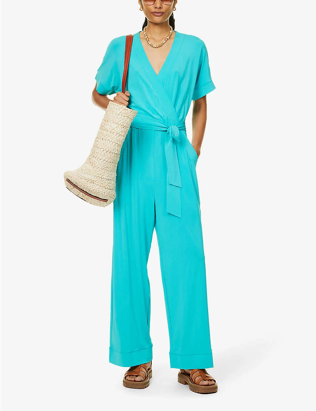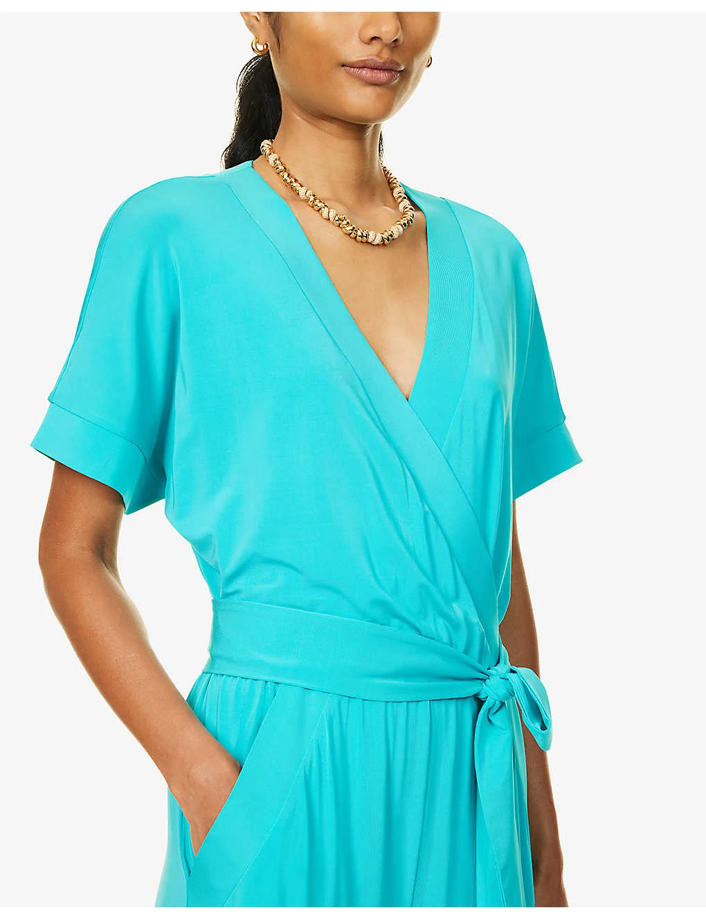 - Regular-fit, V-neck, short sleeves, wrap-over panel at front, gathered elasticated waistband, two slip pockets at front, wide leg
