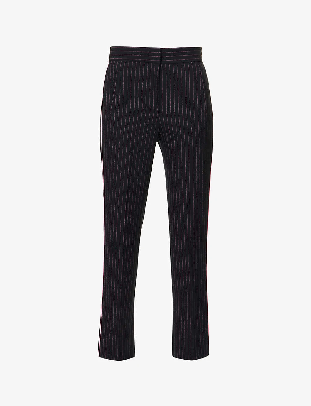 - Regular fit, mid-rise, slim cropped leg, structured waistband, two angled welt pockets at front, darts at back, two welt pockets at back, contrast trim at sides, all-over pinstripe pattern