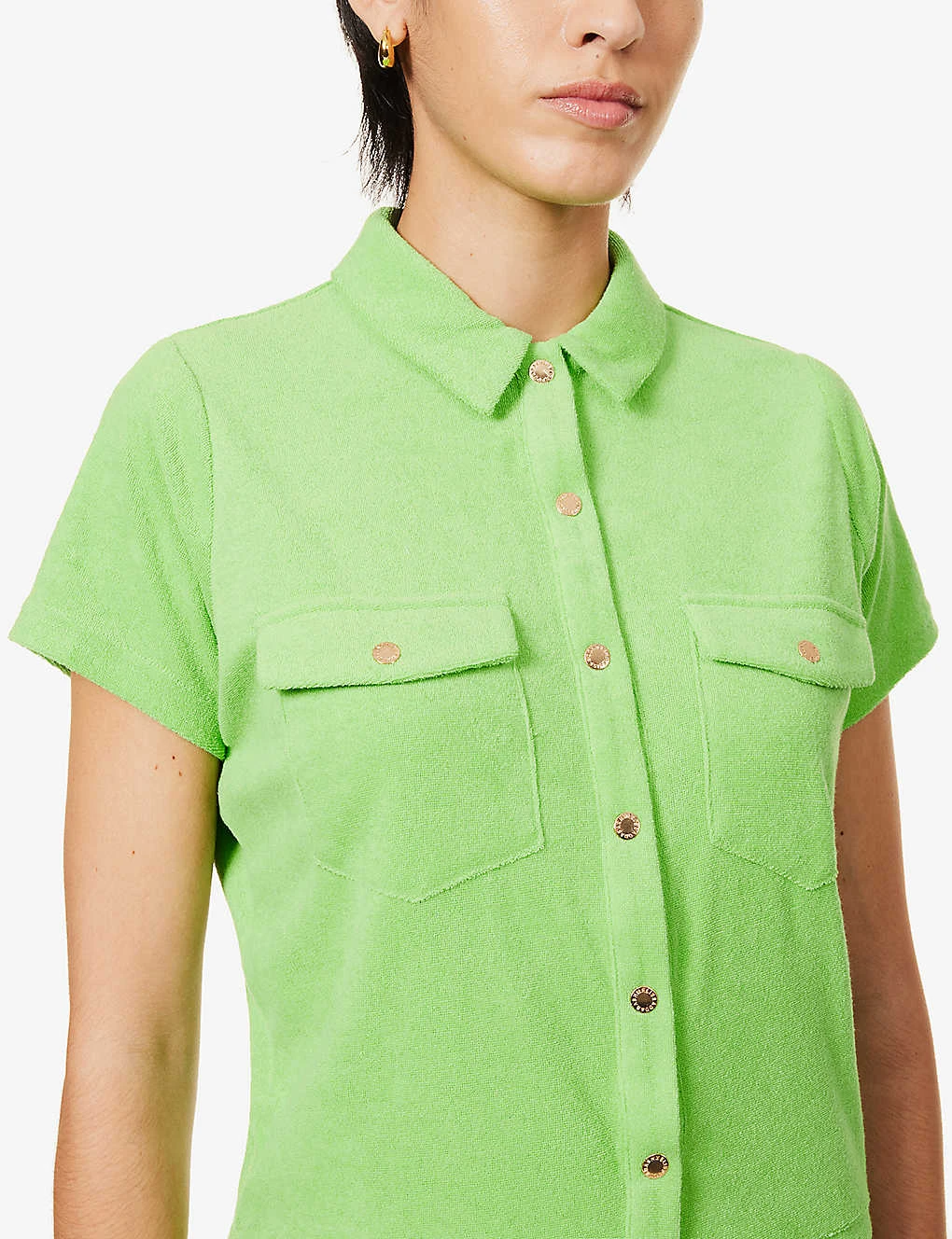 - Fitted, collar, short sleeves, branded gold-toned hardware, two flap pockets at chest, drawstring waist, branded plaque at waist, two slip pockets at sides, all-over towelling texture, partially lined