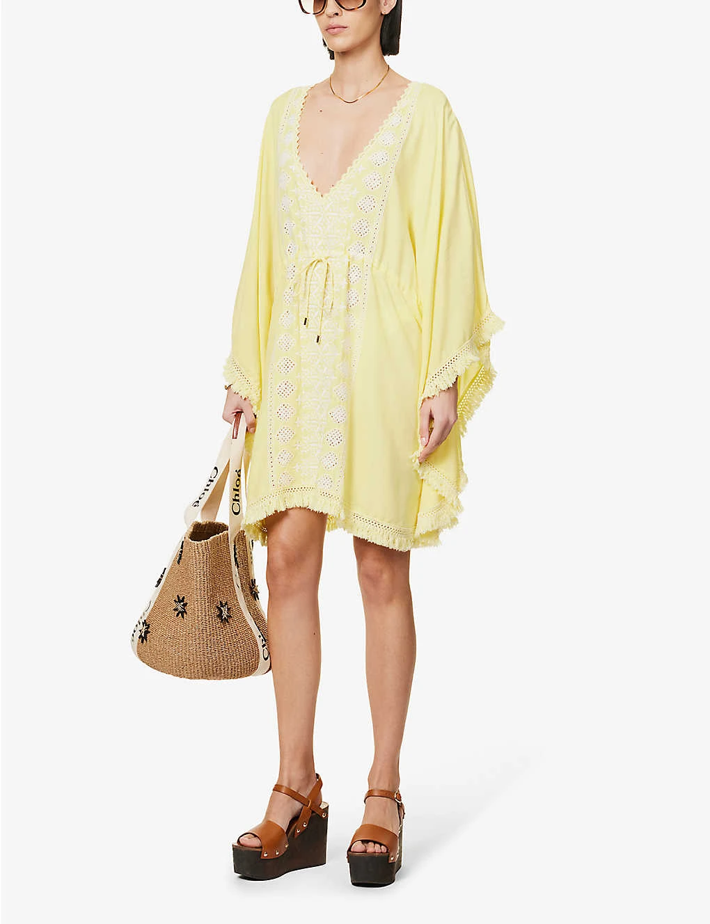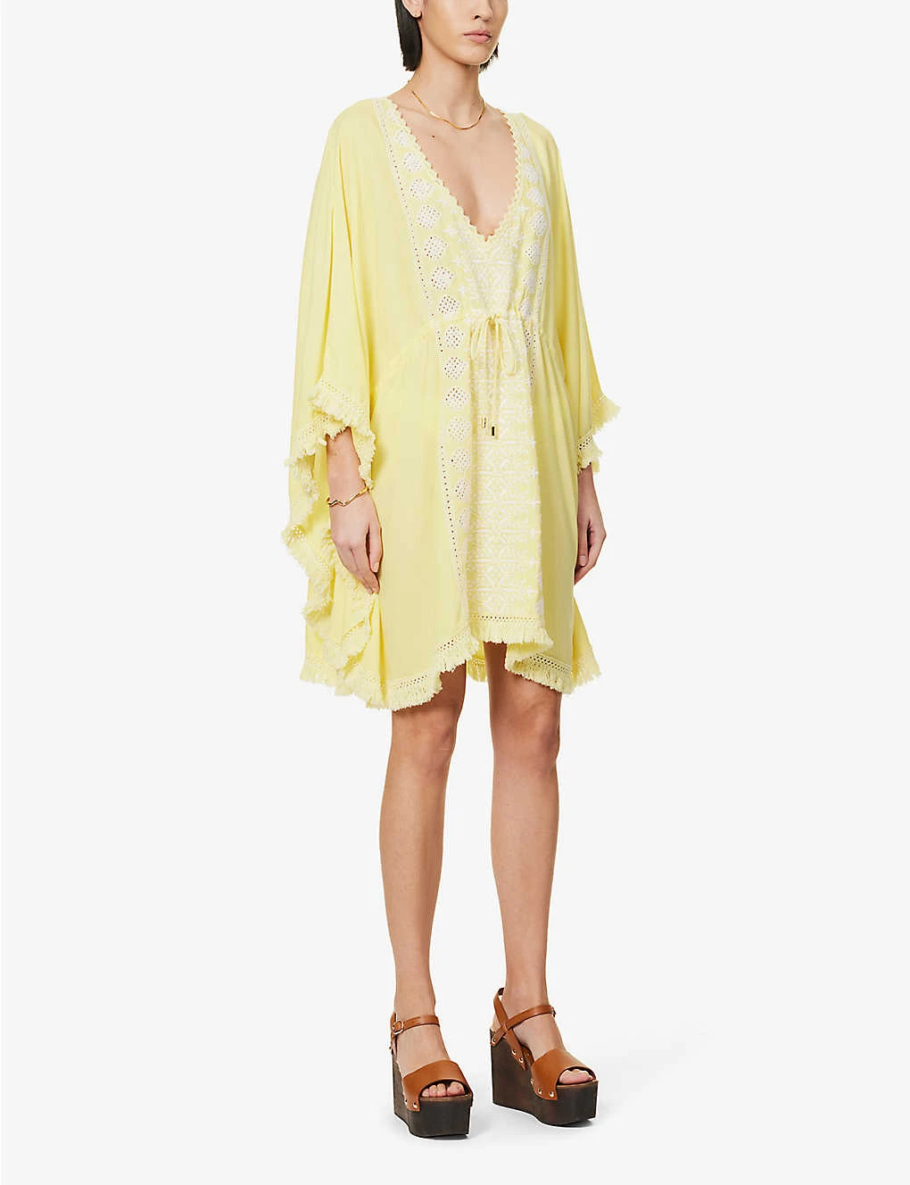 - Relaxed-fit, V-neck, long kimono sleeves, elasticated drawstring waistband, all-over embroidered panels, frayed trims