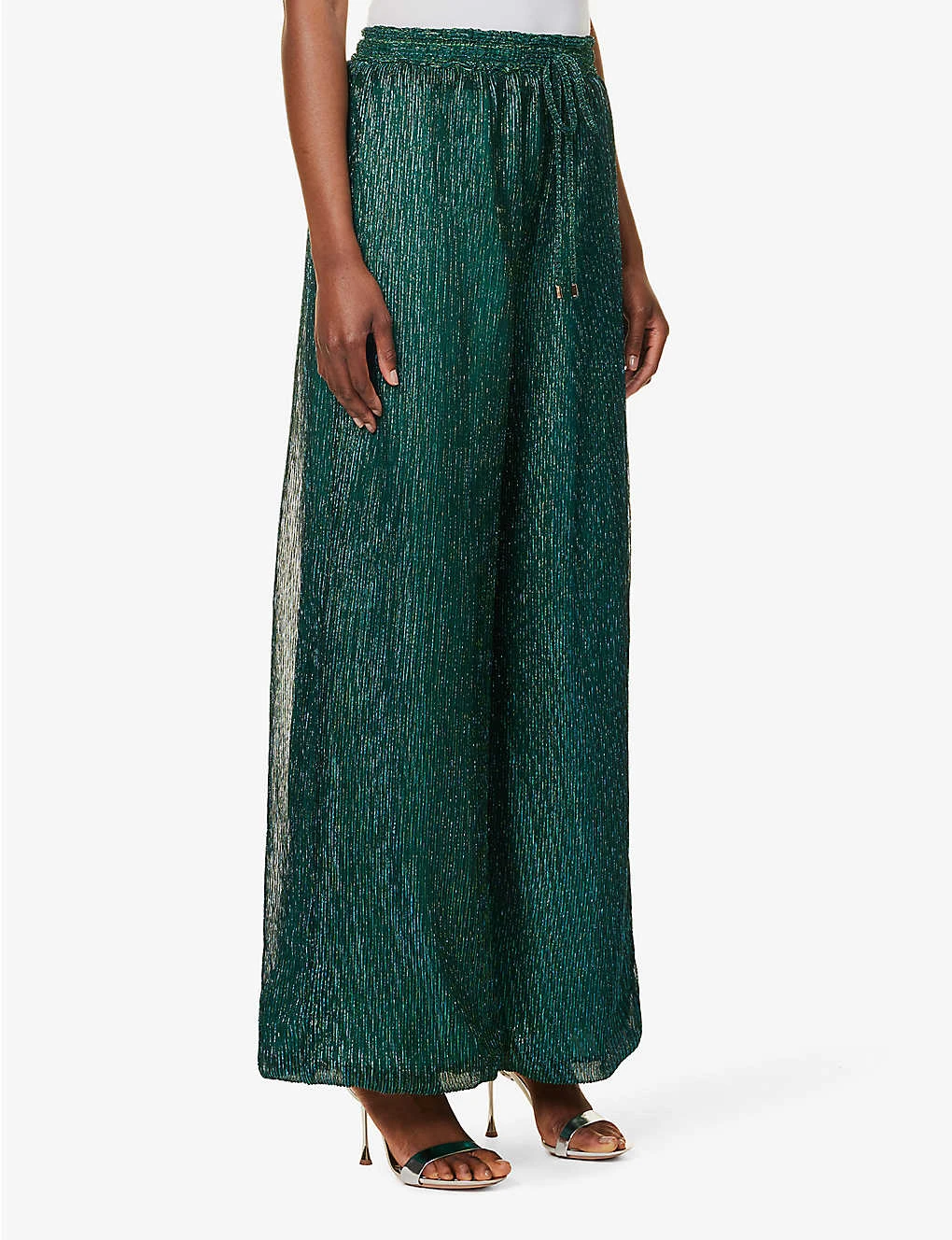 - Relaxed fit, straight wide leg, drawstring elasticated waistband, all over pleated, all over metallic weave, fully lined, curved cuffs