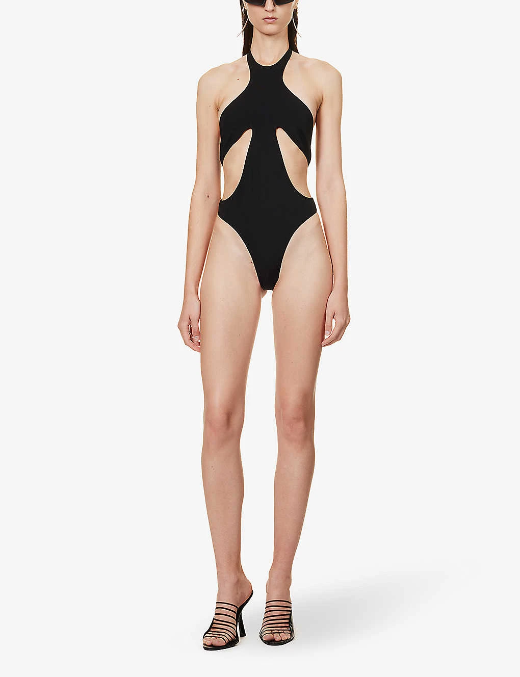 - Slim fit, halterneck, high leg, cut-out panels, branded silver-toned hardware