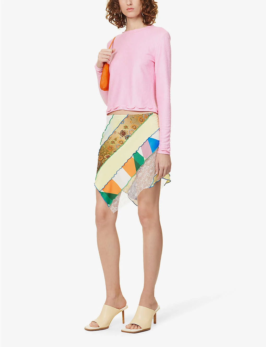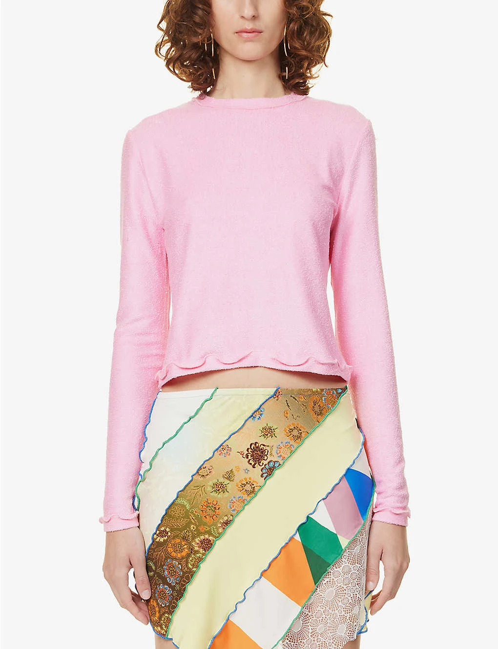 - Regular-fit, scoop neck, tonal piping, long sleeves, all-over textured weave, frilled piping at hem
