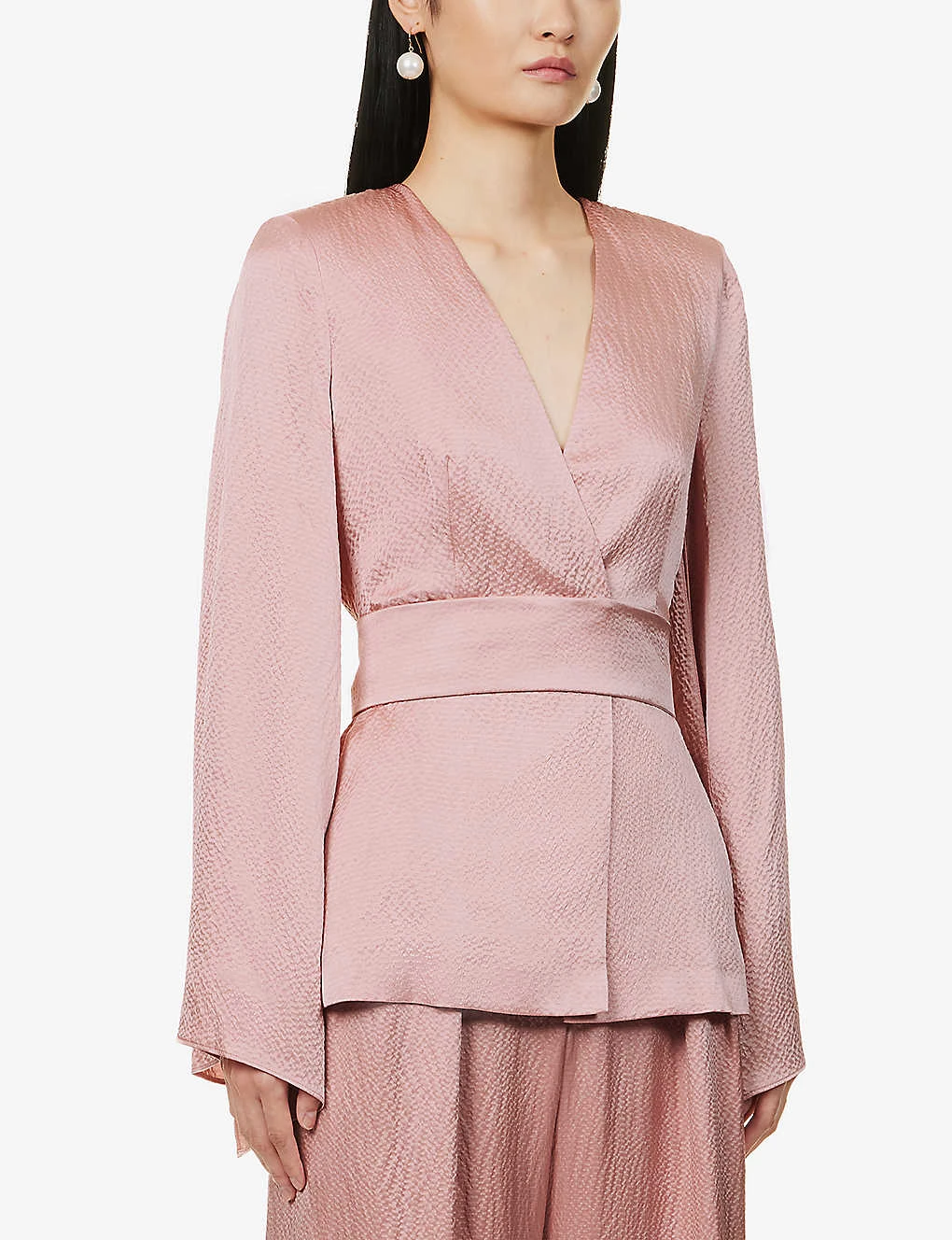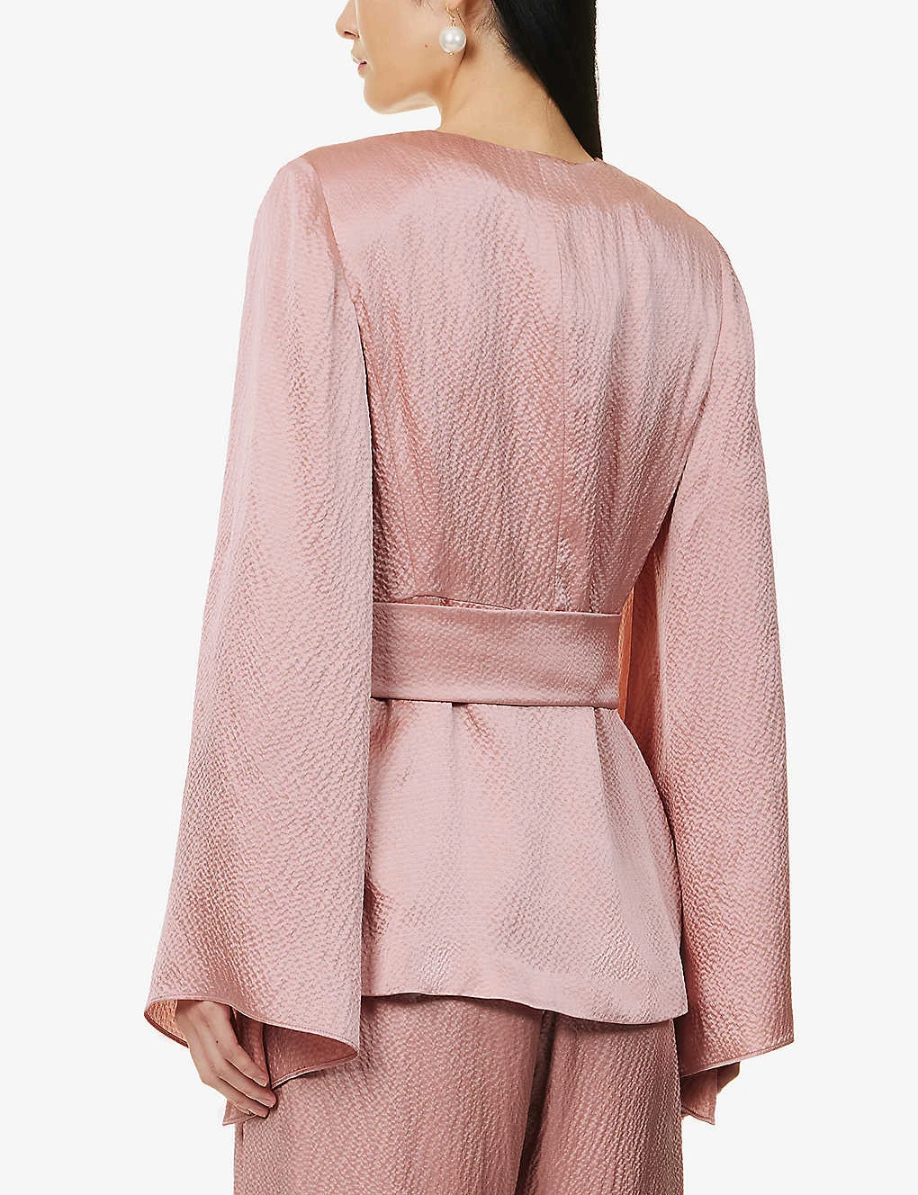 - Regular fit, V-neck, shoulder pads, long wide sleeves with splits, fully lined, detachable self-tie fastening