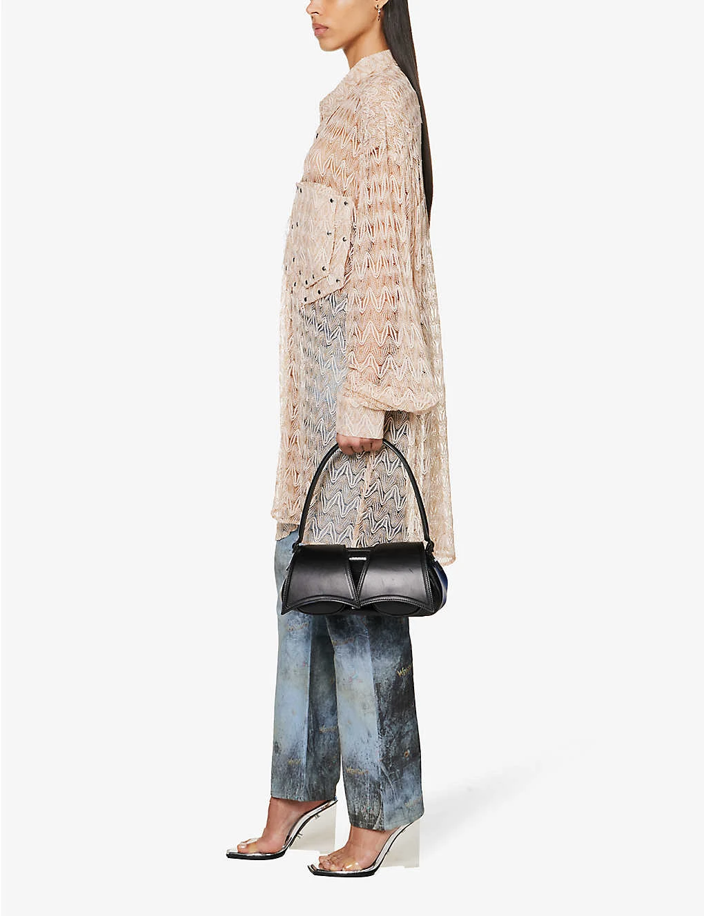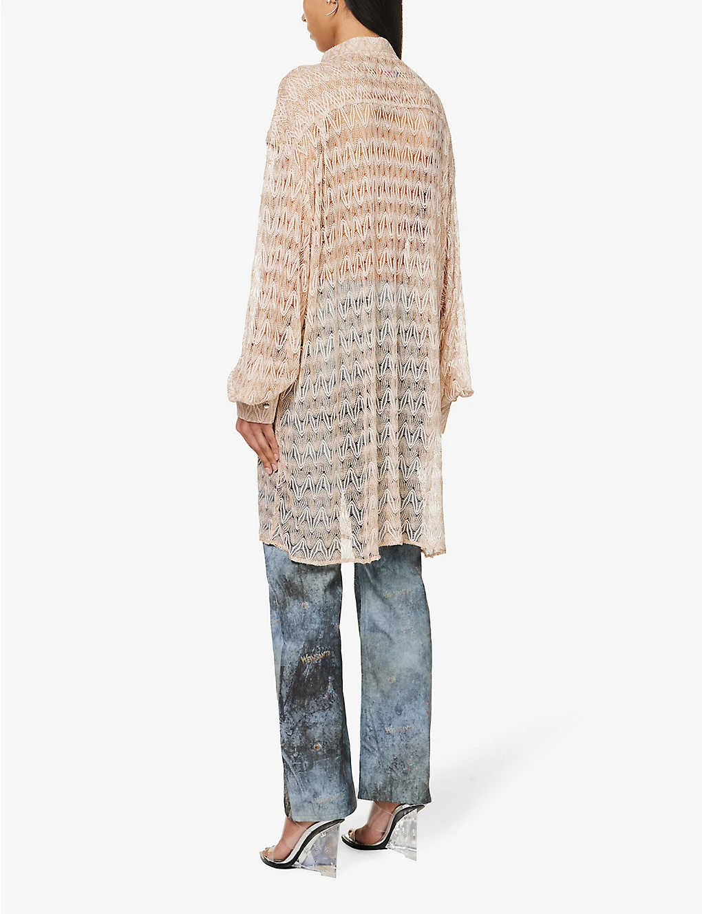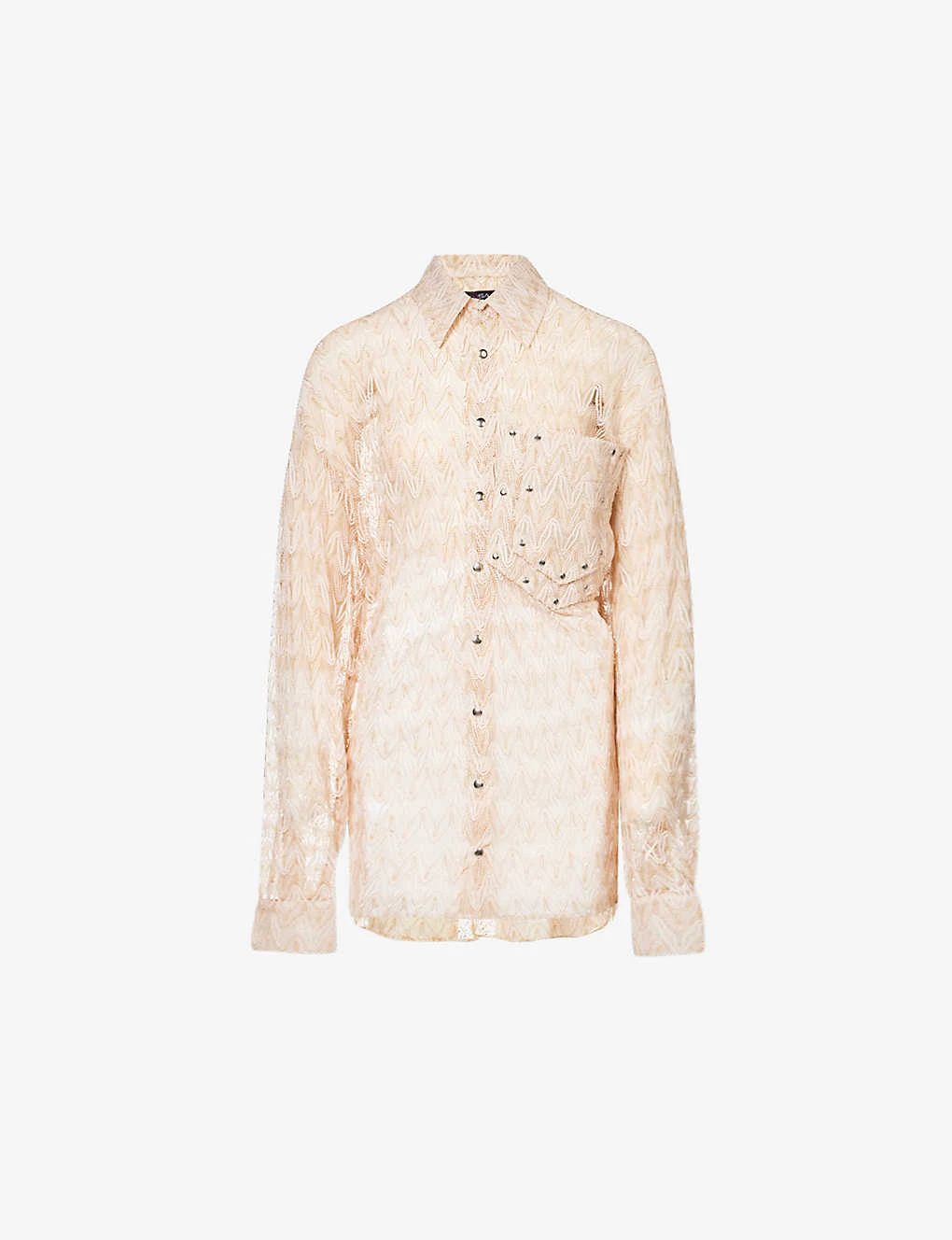 - Oversized fit, collar, long sleeves, buttoned sleeve hems, layered patch pocket at chest, all-over knit pattern, metallic thread weave, silver-toned buttons, sheer