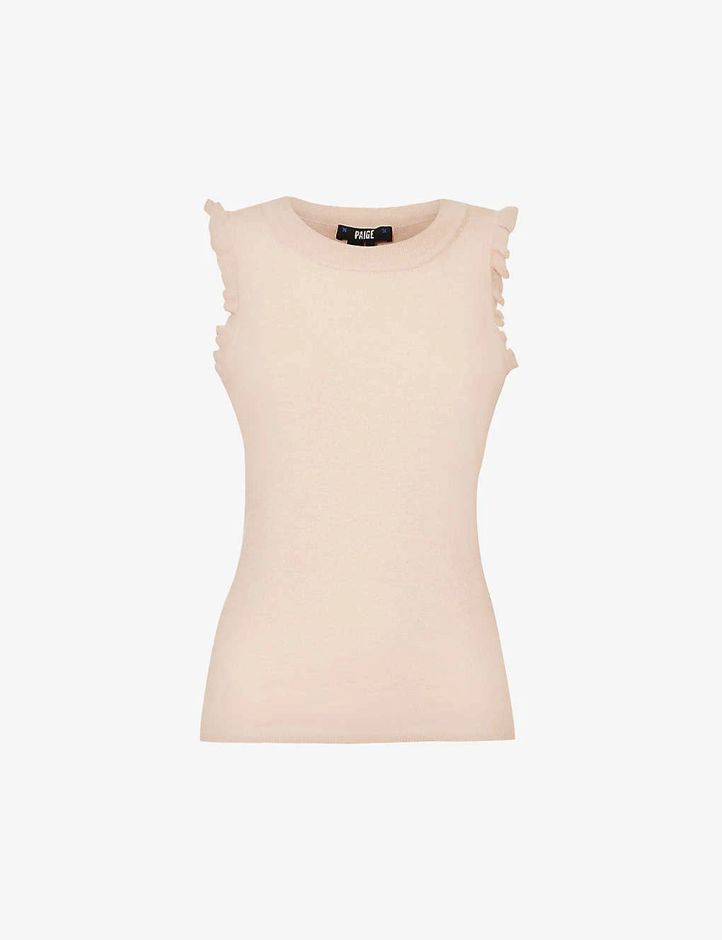 - Regular fit, round neckline, sleeveless, dropped armholes, ruffle trim at armholes, soft metallic weave, fine knit texture, ribbed trims
