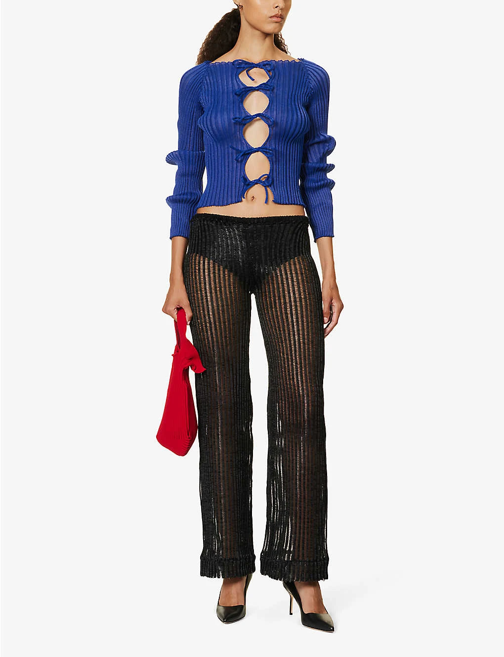 - Regular fit, mid-rise, straight leg, elasticated waistband, knitted, semi-sheer