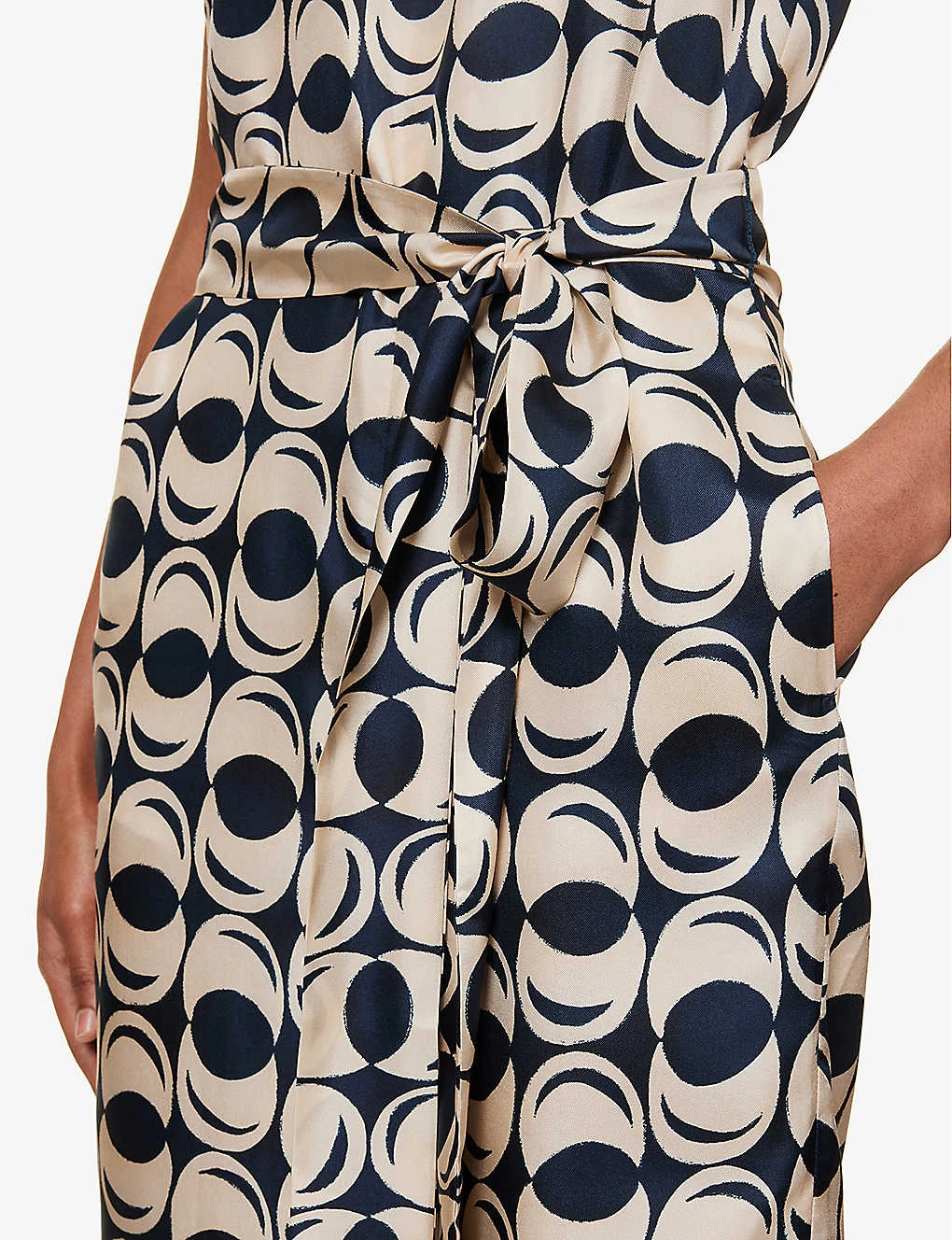 - Regular fit, V-neckline, wide leg, dropped crotch, sleeveless, detachable self-tie belt, soft woven texture, abstract pattern