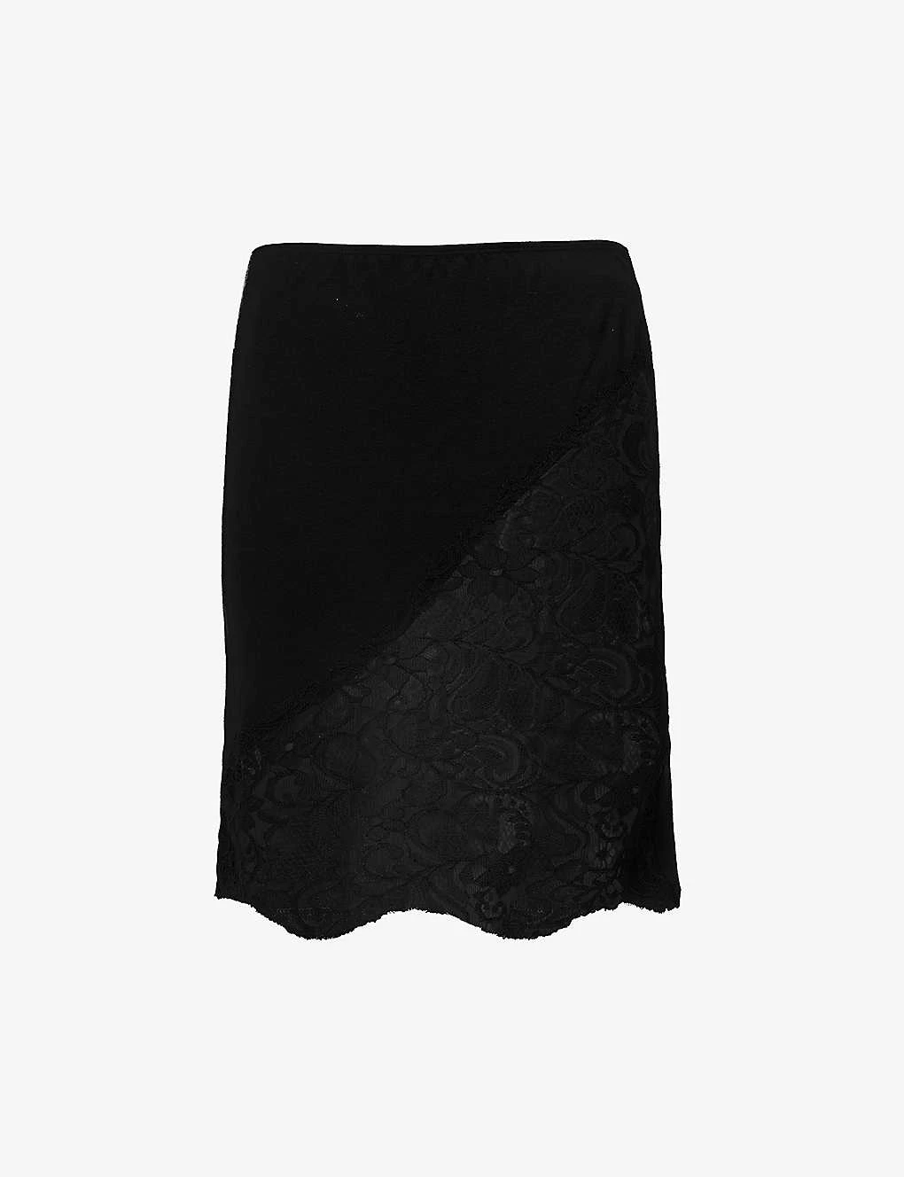 - Slim fit, mid-waist, elasticated waistband, all over knitted, asymmetric lace panel at front and side, scalloped hem