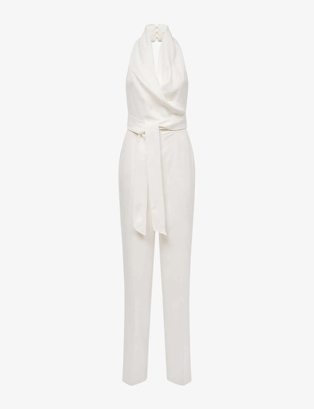 - Halterneck, sleeveless, open-back design, straight leg, self-tie belt at the waist