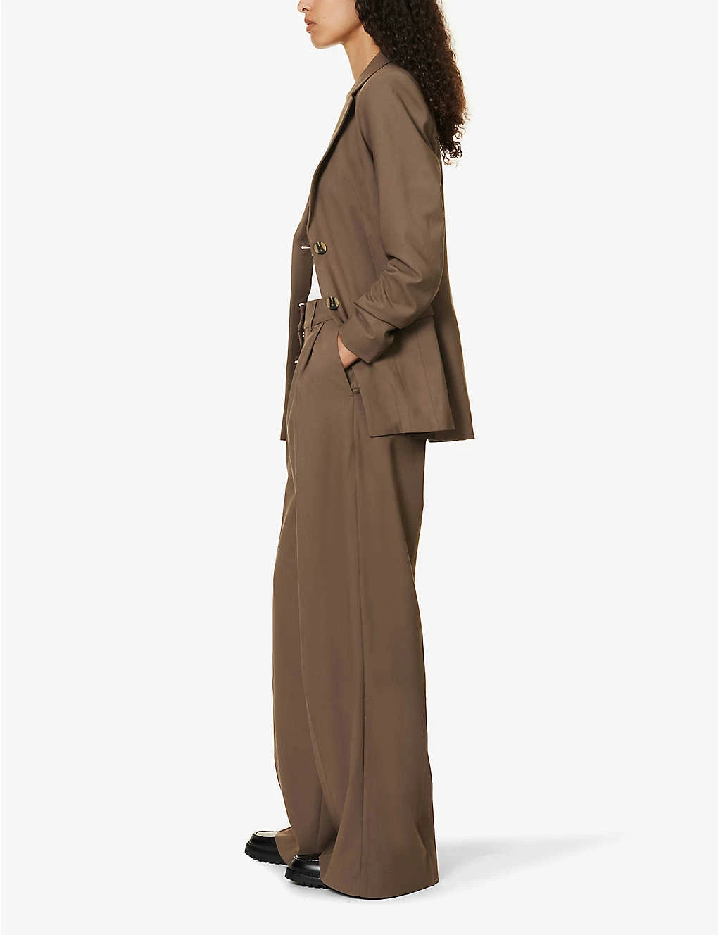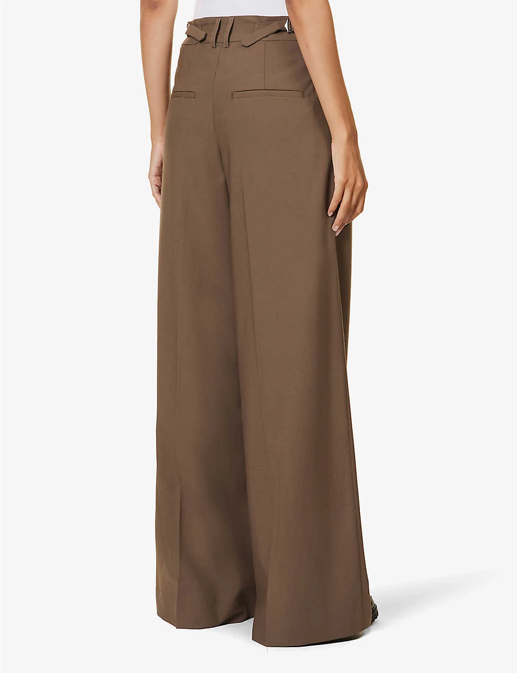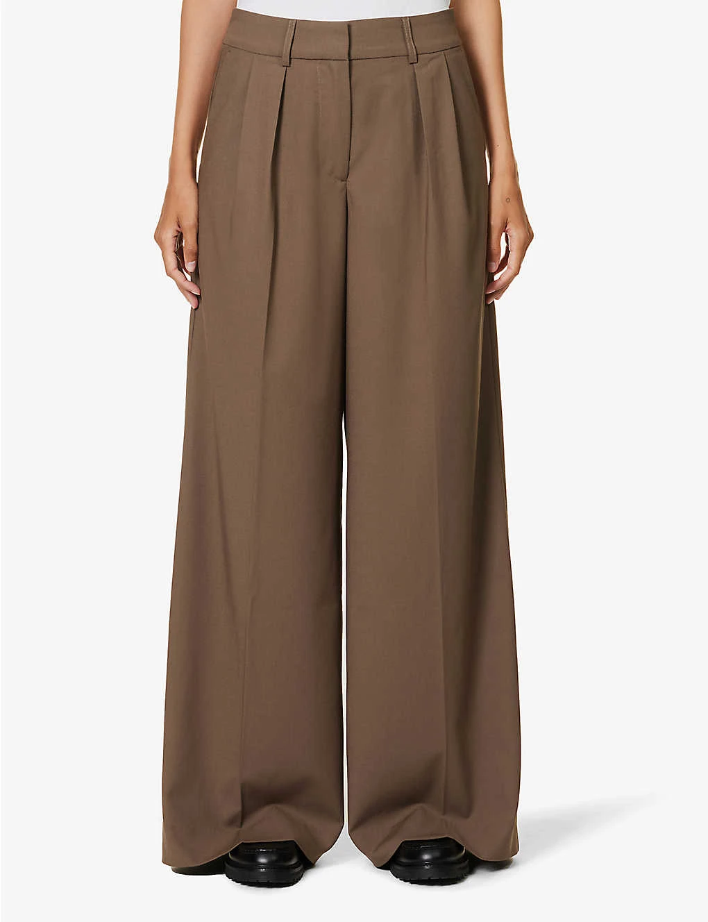 - Relaxed fit, mid-rise, straight leg, structured waistband with belt loops, waist adjusters, pleats at front, two slip pockets at front, darts at back, two welt pockets at back, pressed centre creases