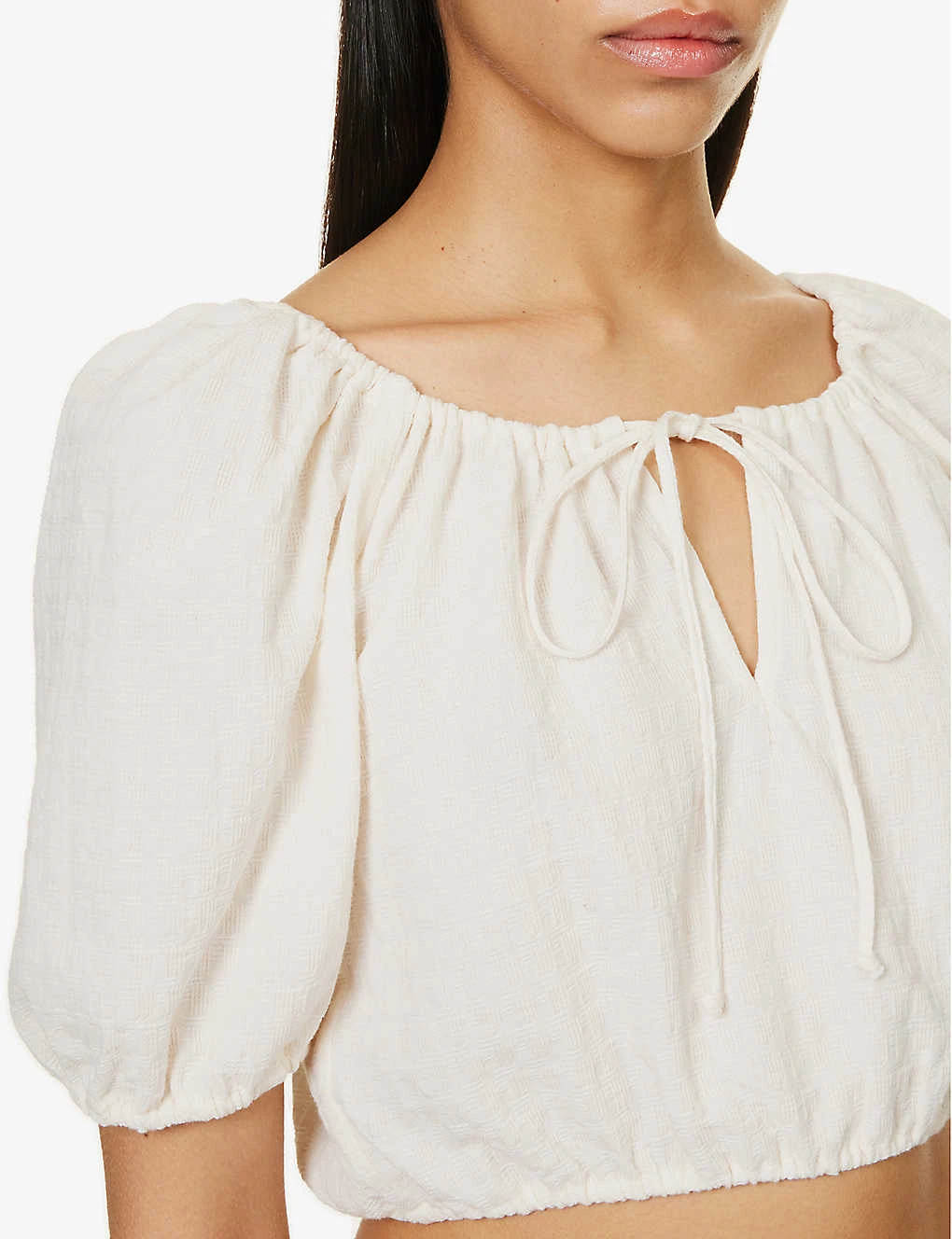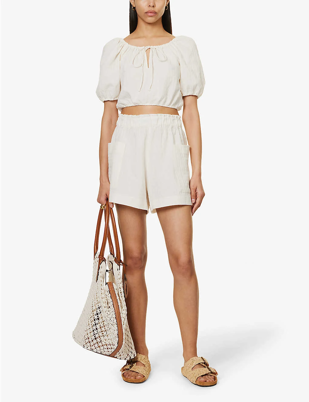 - Relaxed fit, round neck, self-tie fastening at neck, short sleeves, elasticated hems, cropped