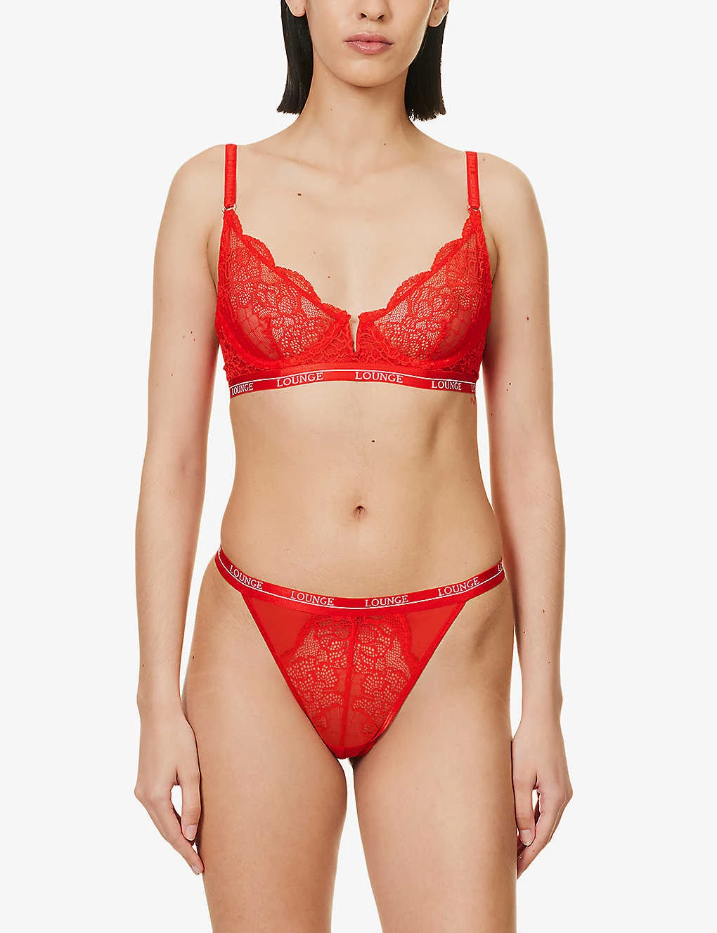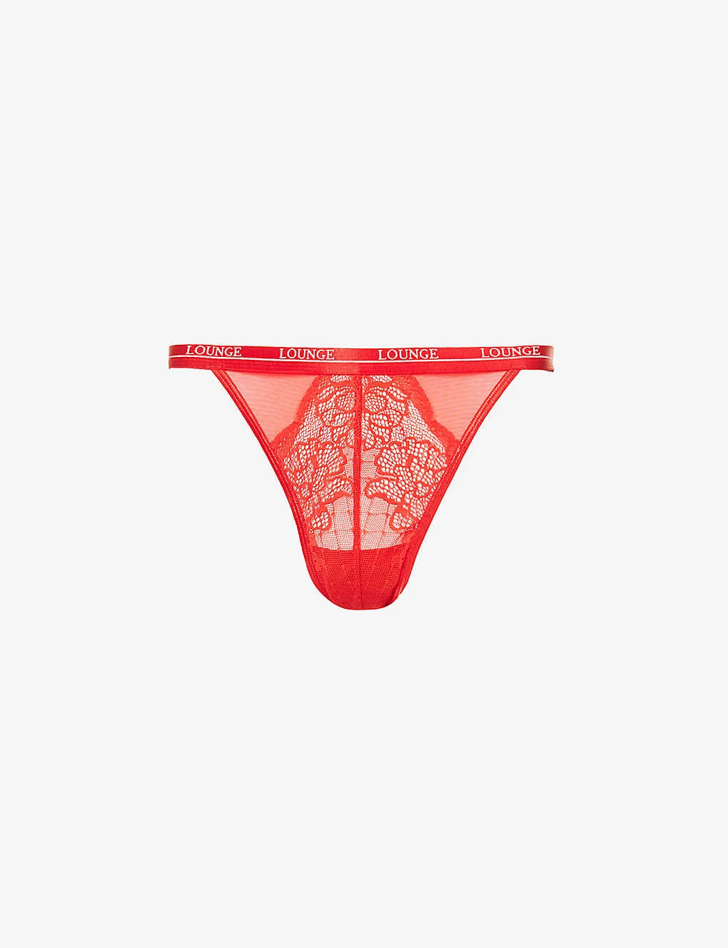- High rise, high leg, branded elasticated waistband, semi-sheer, floral lace, V-string at back, lined gusset