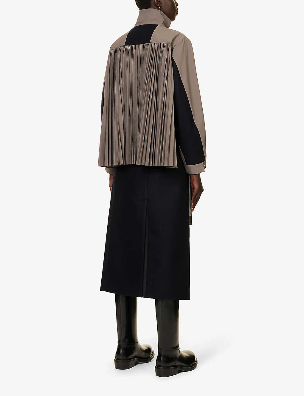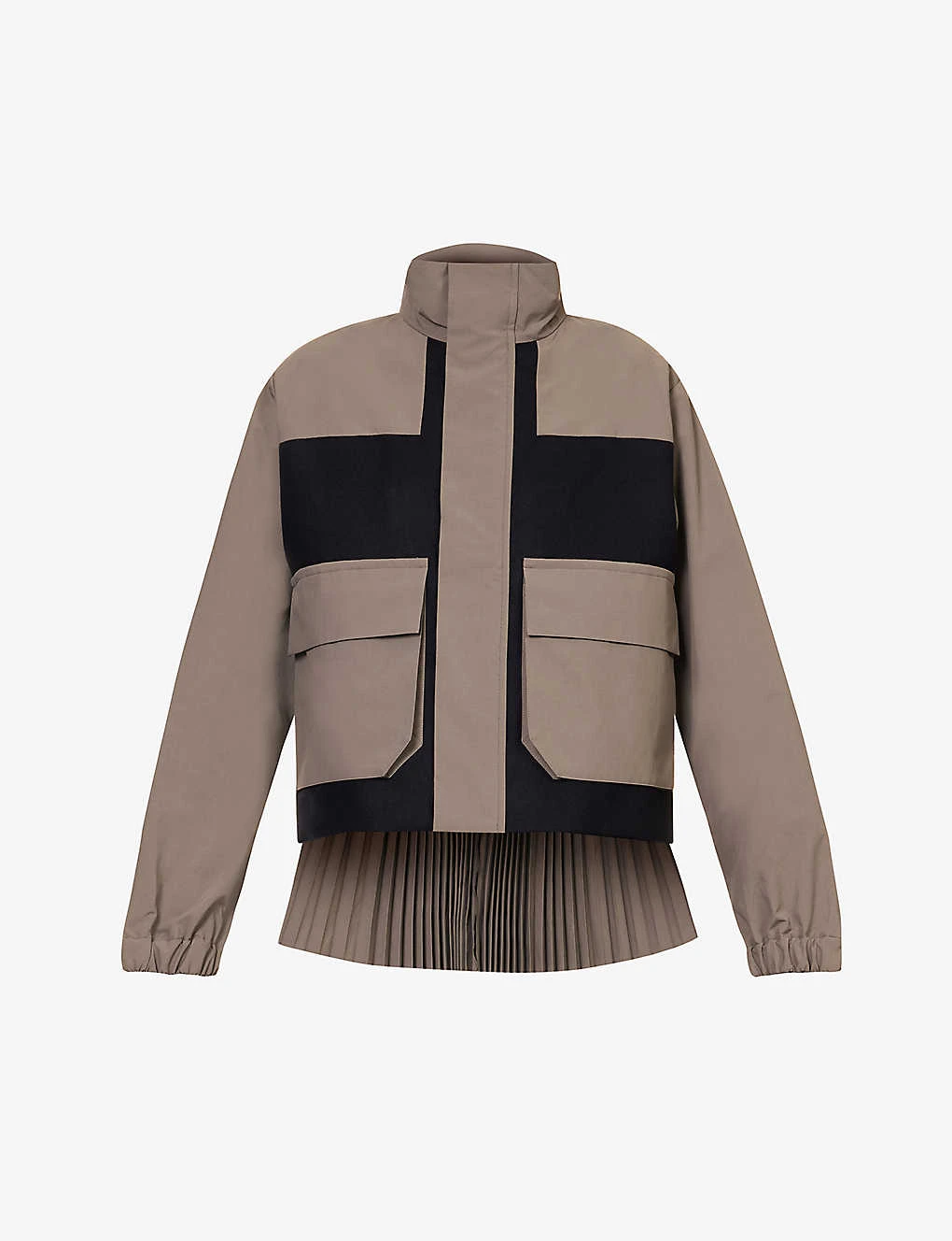 - Regular fit, high neck, long sleeves, adjustable elasticated cuffs, two flap pockets at front, all-over contrasting panels, pleated back, panel, dipped hem at back, partially lined