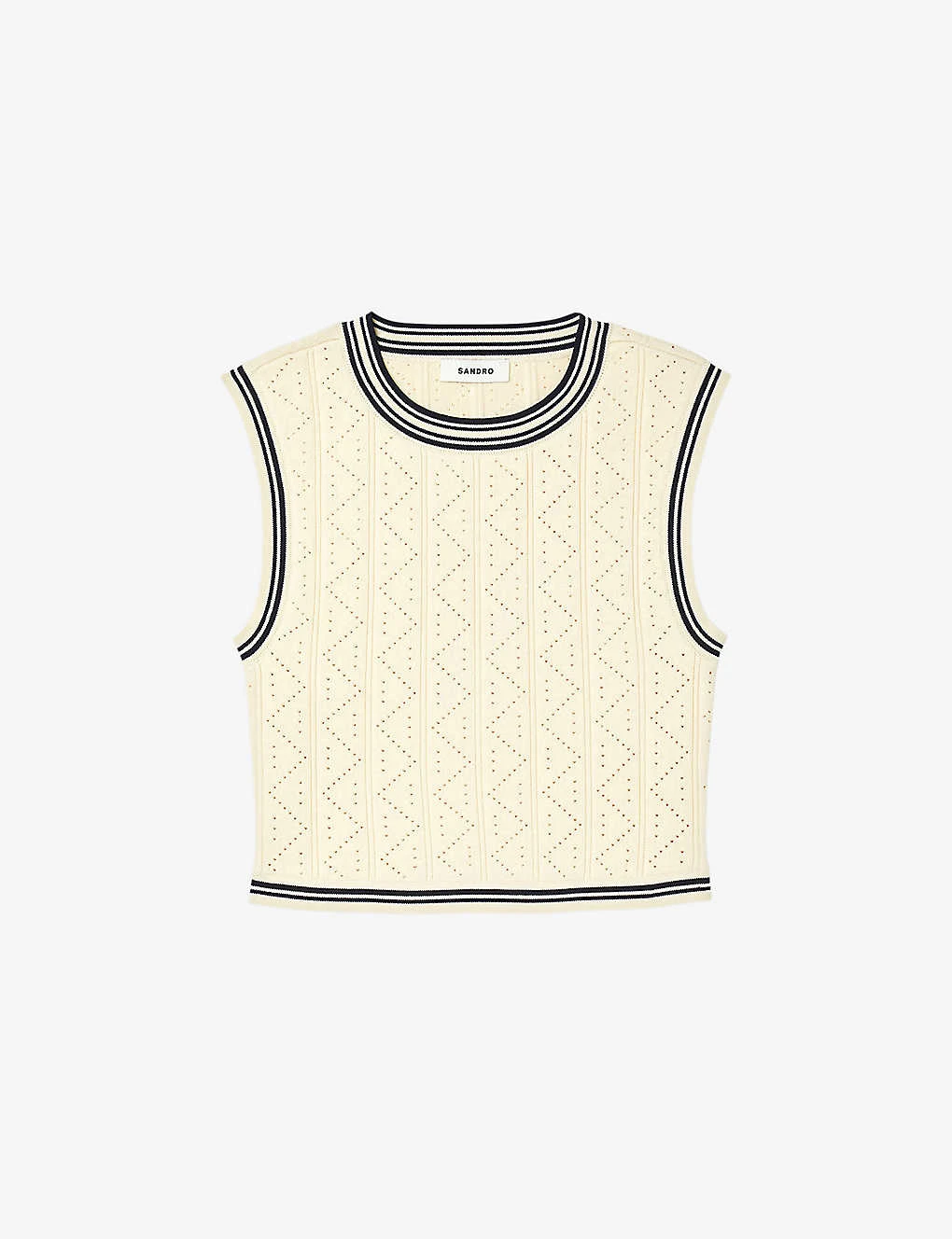- Round neck, contrast-band at the neckline, sleeveless, all-over pointelle stripe design, cropped silhouette