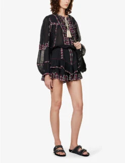 - Slim fit, mid-rise, elasticated waistband, ruched pattern, all-over crystal embellishment, raw hem