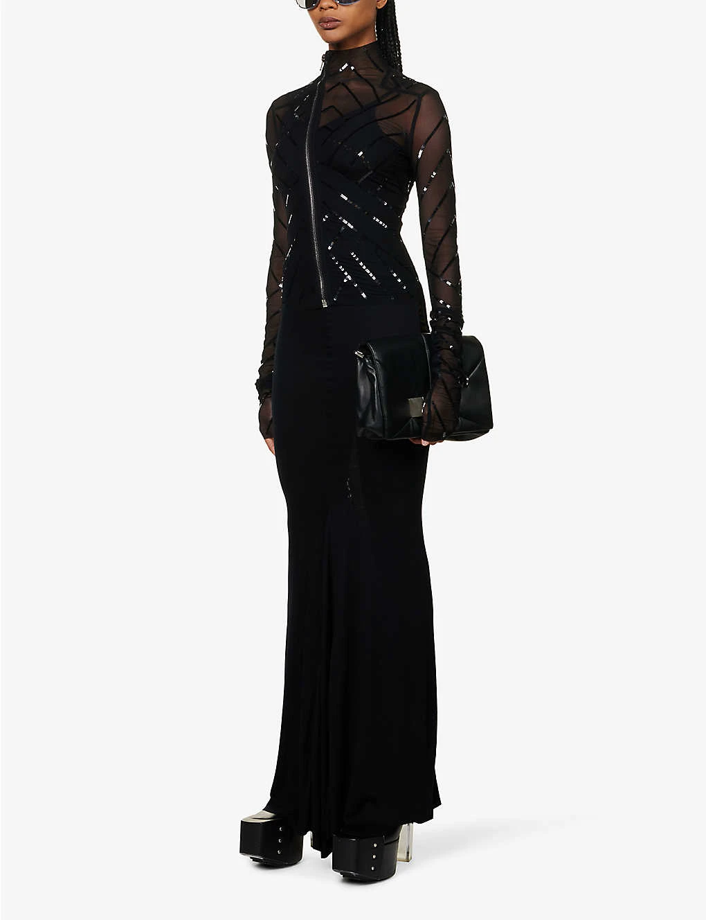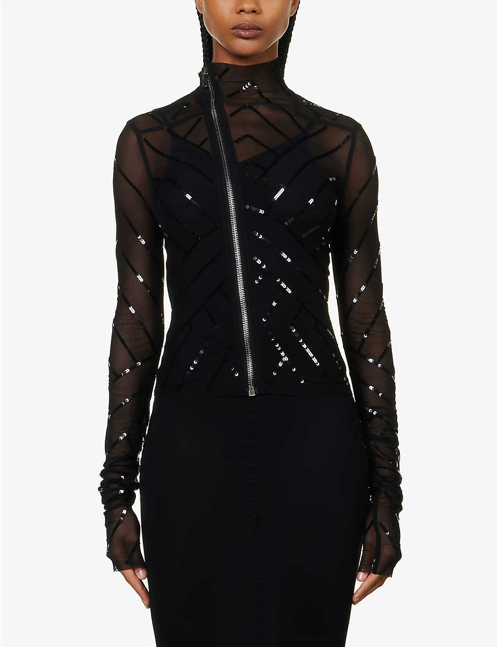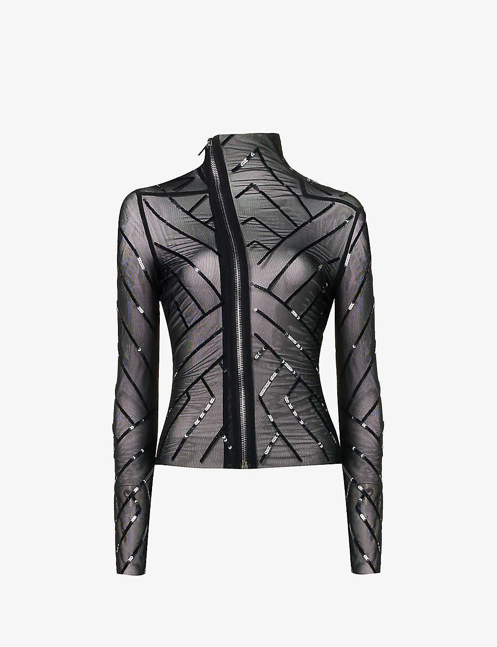 - Slim fit, high neck, long sleeves, all-over sequin embellishment, sheer, silver-toned hardware