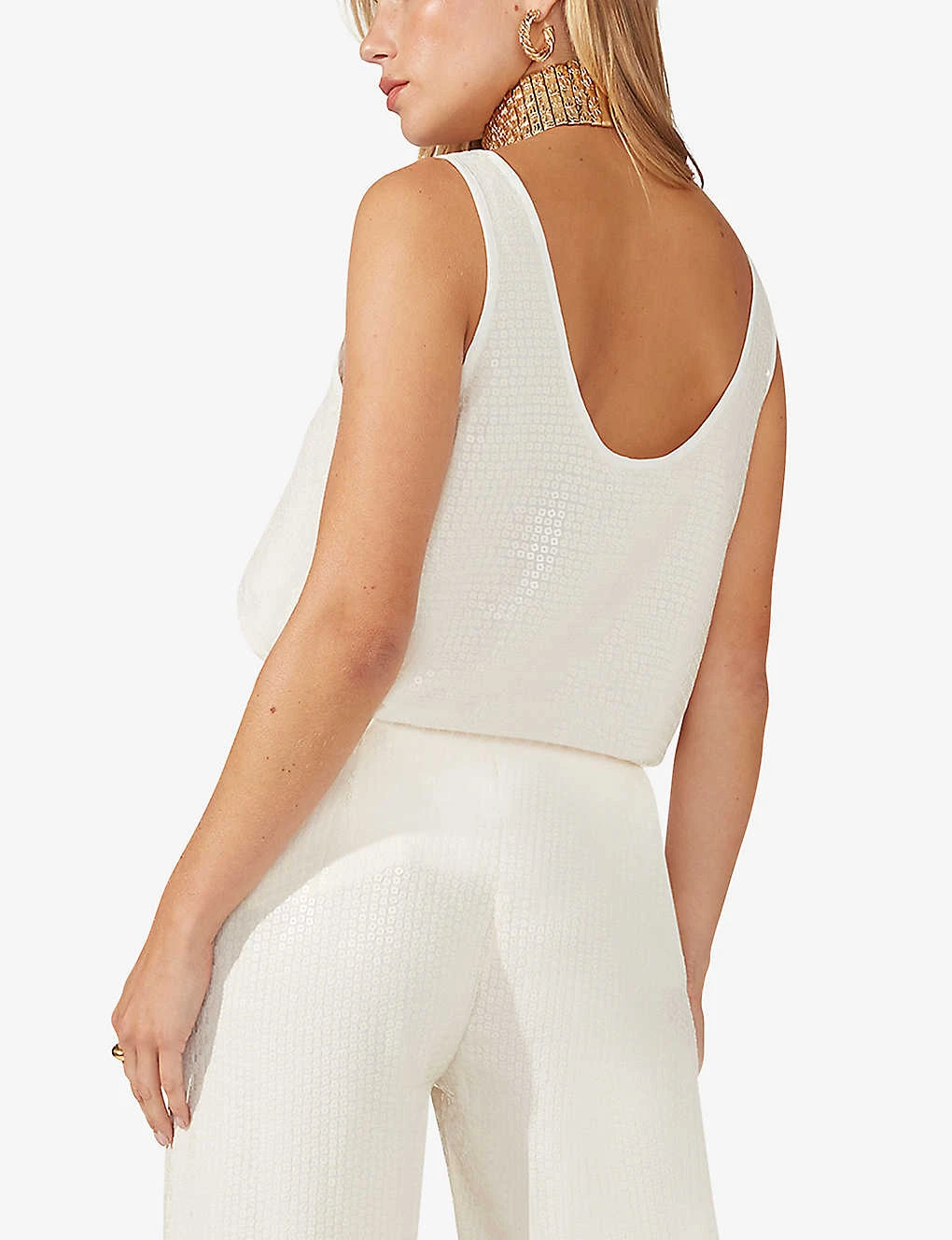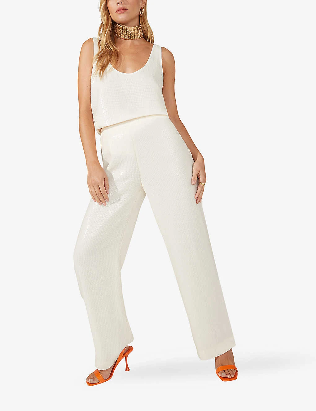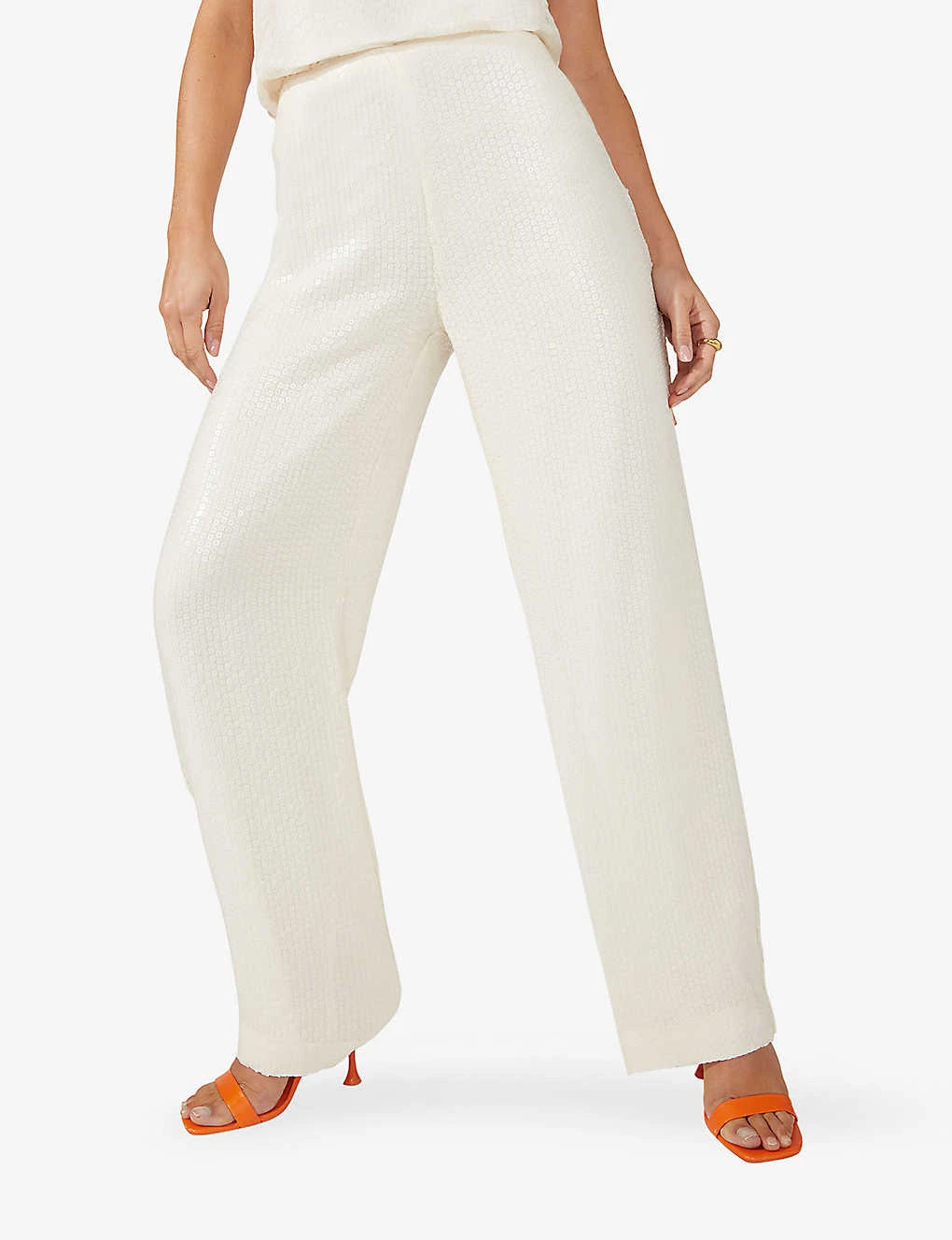 - Structured waistband, mid rise, straight leg, all-over sequin pattern