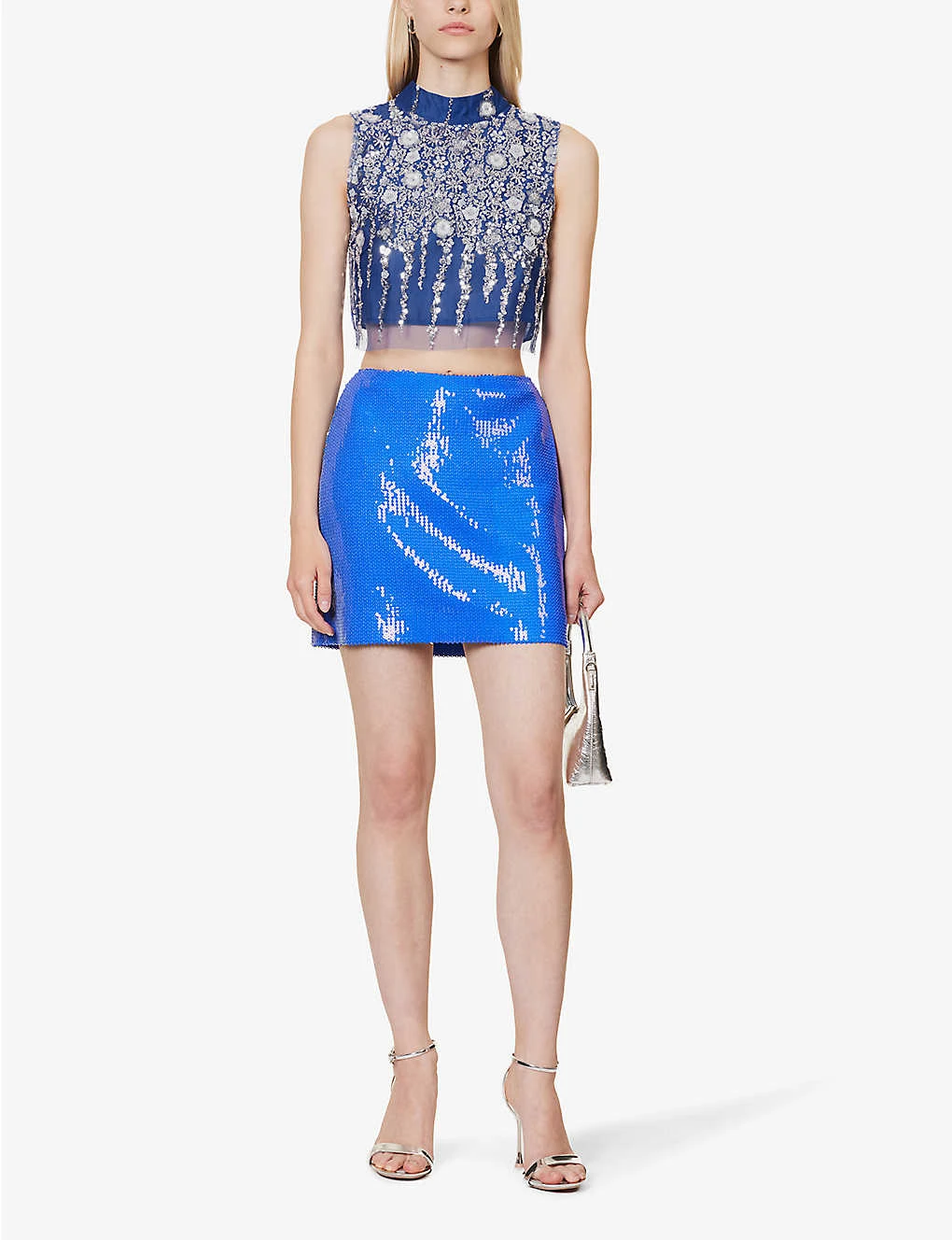 - Regular fit, cropped, high neck, sleeveless, self-tie fastening and cut-out at front, all over flower design sequin embellishment, all over mesh texture, fully lined, straight hem