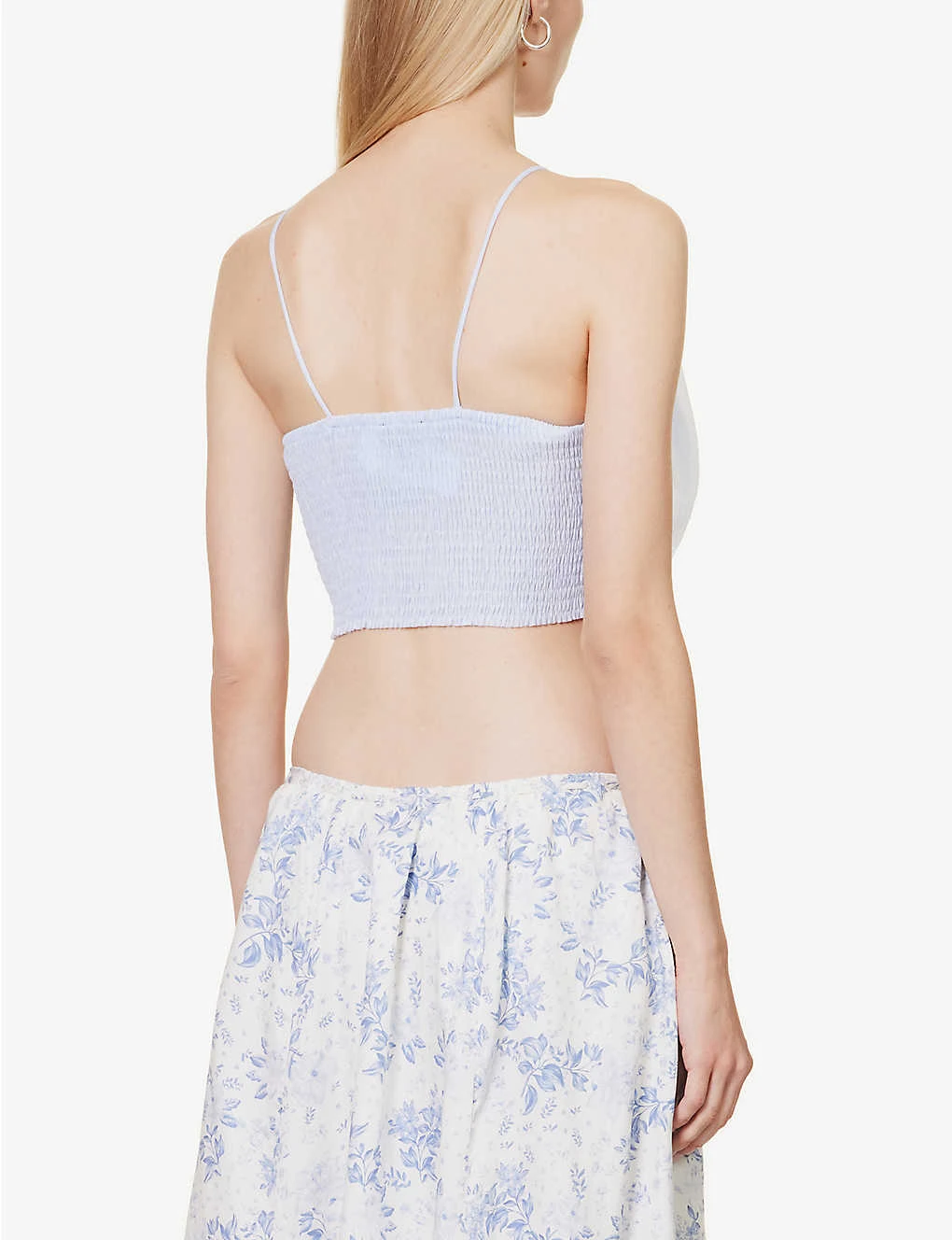 - Slim fit, cropped, shoulder straps, flower design panel at front, smock panel at back